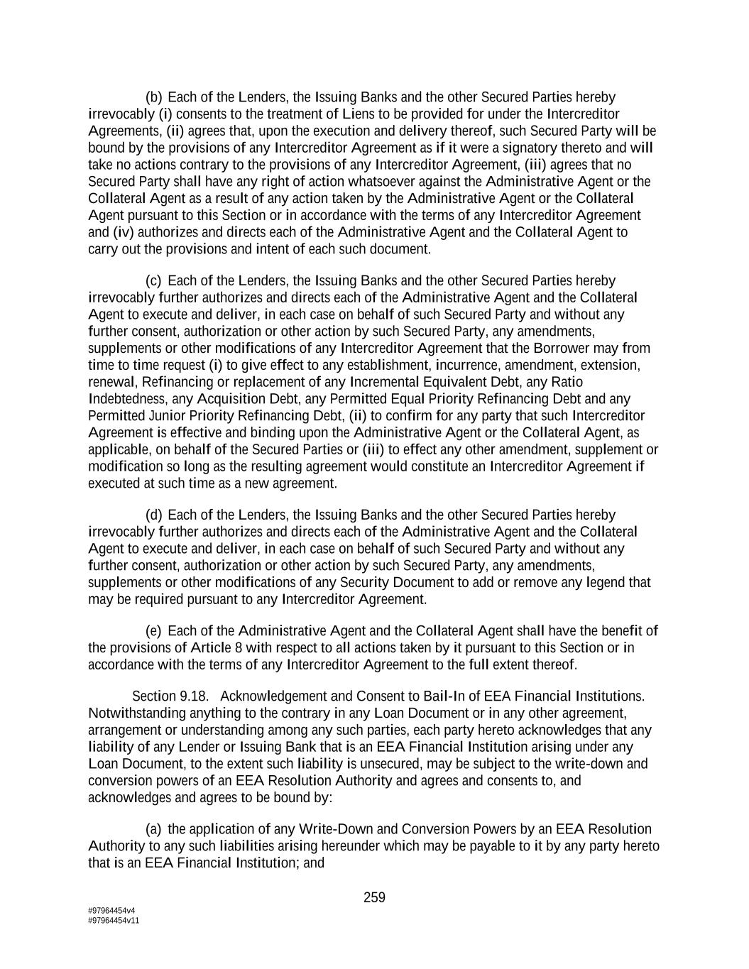 259 #97964454v4 #97964454v11 (b) Each of the Lenders, the Issuing Banks and the other Secured Parties hereby irrevocably (i) consents to the treatment of Liens to be provided for under the Intercreditor Agreements, (ii) agrees that, upon the execution and delivery thereof, such Secured Party will be bound by the provisions of any Intercreditor Agreement as if it were a signatory thereto and will take no actions contrary to the provisions of any Intercreditor Agreement, (iii) agrees that no Secured Party shall have any right of action whatsoever against the Administrative Agent or the Collateral Agent as a result of any action taken by the Administrative Agent or the Collateral Agent pursuant to this Section or in accordance with the terms of any Intercreditor Agreement and (iv) authorizes and directs each of the Administrative Agent and the Collateral Agent to carry out the provisions and intent of each such document. (c) Each of the Lenders, the Issuing Banks and the other Secured Parties hereby irrevocably further authorizes and directs each of the Administrative Agent and the Collateral Agent to execute and deliver, in each case on behalf of such Secured Party and without any further consent, authorization or other action by such Secured Party, any amendments, supplements or other modifications of any Intercreditor Agreement that the Borrower may from time to time request (i) to give effect to any establishment, incurrence, amendment, extension, renewal, Refinancing or replacement of any Incremental Equivalent Debt, any Ratio Indebtedness, any Acquisition Debt, any Permitted Equal Priority Refinancing Debt and any Permitted Junior Priority Refinancing Debt, (ii) to confirm for any party that such Intercreditor Agreement is effective and binding upon the Administrative Agent or the Collateral Agent, as applicable, on behalf of the Secured Parties or (iii) to effect any other amendment, supplement or modification so long as the resulting agreement would constitute an Intercreditor Agreement if executed at such time as a new agreement. (d) Each of the Lenders, the Issuing Banks and the other Secured Parties hereby irrevocably further authorizes and directs each of the Administrative Agent and the Collateral Agent to execute and deliver, in each case on behalf of such Secured Party and without any further consent, authorization or other action by such Secured Party, any amendments, supplements or other modifications of any Security Document to add or remove any legend that may be required pursuant to any Intercreditor Agreement. (e) Each of the Administrative Agent and the Collateral Agent shall have the benefit of the provisions of Article 8 with respect to all actions taken by it pursuant to this Section or in accordance with the terms of any Intercreditor Agreement to the full extent thereof. Section 9.18. Acknowledgement and Consent to Bail-In of EEA Financial Institutions. Notwithstanding anything to the contrary in any Loan Document or in any other agreement, arrangement or understanding among any such parties, each party hereto acknowledges that any liability of any Lender or Issuing Bank that is an EEA Financial Institution arising under any Loan Document, to the extent such liability is unsecured, may be subject to the write-down and conversion powers of an EEA Resolution Authority and agrees and consents to, and acknowledges and agrees to be bound by: (a) the application of any Write-Down and Conversion Powers by an EEA Resolution Authority to any such liabilities arising hereunder which may be payable to it by any party hereto that is an EEA Financial Institution; and