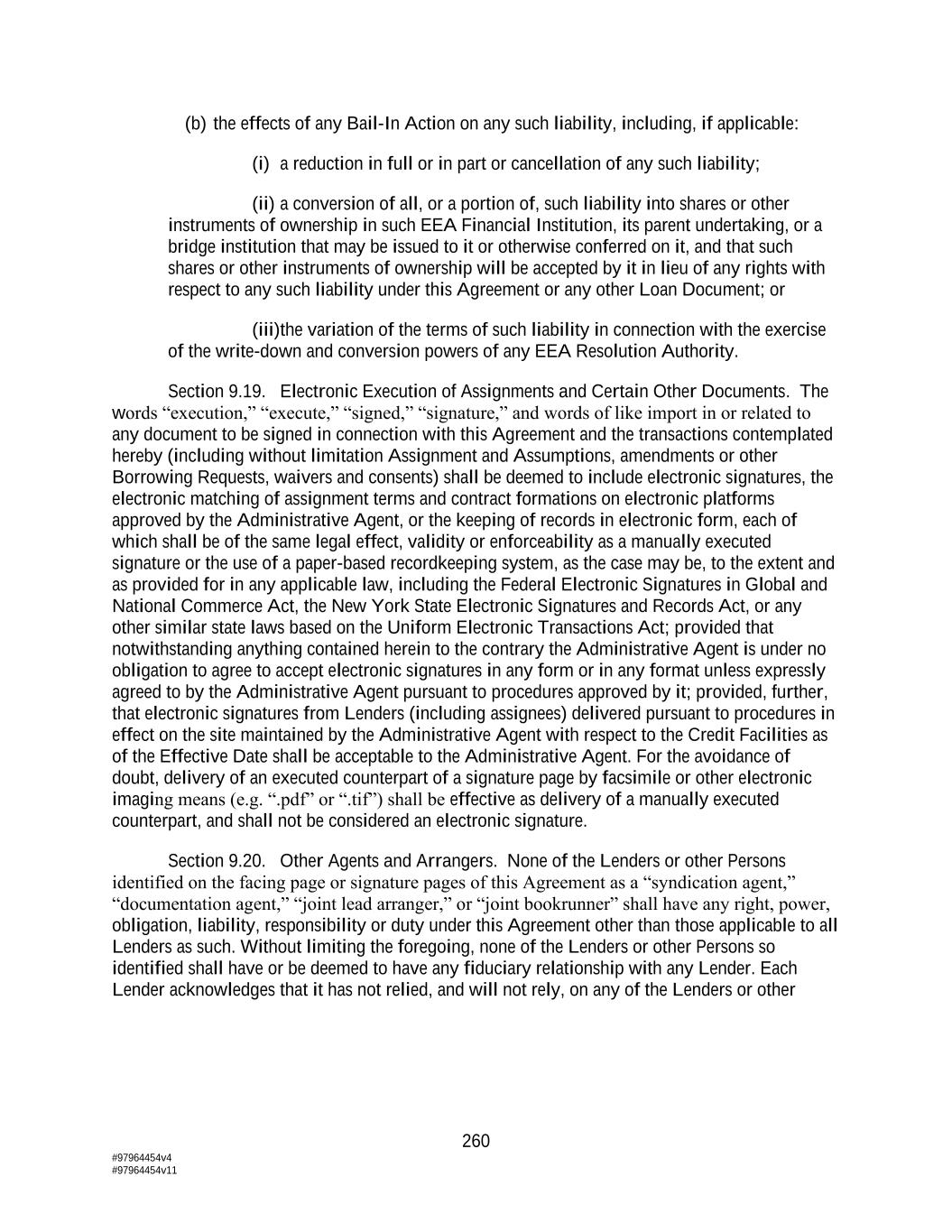 260 #97964454v4 #97964454v11 (b) the effects of any Bail-In Action on any such liability, including, if applicable: (i) a reduction in full or in part or cancellation of any such liability; (ii) a conversion of all, or a portion of, such liability into shares or other instruments of ownership in such EEA Financial Institution, its parent undertaking, or a bridge institution that may be issued to it or otherwise conferred on it, and that such shares or other instruments of ownership will be accepted by it in lieu of any rights with respect to any such liability under this Agreement or any other Loan Document; or (iii)the variation of the terms of such liability in connection with the exercise of the write-down and conversion powers of any EEA Resolution Authority. Section 9.19. Electronic Execution of Assignments and Certain Other Documents. The words “execution,” “execute,” “signed,” “signature,” and words of like import in or related to any document to be signed in connection with this Agreement and the transactions contemplated hereby (including without limitation Assignment and Assumptions, amendments or other Borrowing Requests, waivers and consents) shall be deemed to include electronic signatures, the electronic matching of assignment terms and contract formations on electronic platforms approved by the Administrative Agent, or the keeping of records in electronic form, each of which shall be of the same legal effect, validity or enforceability as a manually executed signature or the use of a paper-based recordkeeping system, as the case may be, to the extent and as provided for in any applicable law, including the Federal Electronic Signatures in Global and National Commerce Act, the New York State Electronic Signatures and Records Act, or any other similar state laws based on the Uniform Electronic Transactions Act; provided that notwithstanding anything contained herein to the contrary the Administrative Agent is under no obligation to agree to accept electronic signatures in any form or in any format unless expressly agreed to by the Administrative Agent pursuant to procedures approved by it; provided, further, that electronic signatures from Lenders (including assignees) delivered pursuant to procedures in effect on the site maintained by the Administrative Agent with respect to the Credit Facilities as of the Effective Date shall be acceptable to the Administrative Agent. For the avoidance of doubt, delivery of an executed counterpart of a signature page by facsimile or other electronic imaging means (e.g. “.pdf” or “.tif”) shall be effective as delivery of a manually executed counterpart, and shall not be considered an electronic signature. Section 9.20. Other Agents and Arrangers. None of the Lenders or other Persons identified on the facing page or signature pages of this Agreement as a “syndication agent,” “documentation agent,” “joint lead arranger,” or “joint bookrunner” shall have any right, power, obligation, liability, responsibility or duty under this Agreement other than those applicable to all Lenders as such. Without limiting the foregoing, none of the Lenders or other Persons so identified shall have or be deemed to have any fiduciary relationship with any Lender. Each Lender acknowledges that it has not relied, and will not rely, on any of the Lenders or other