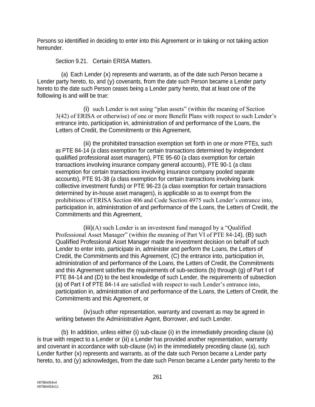 261 #97964454v4 #97964454v11 Persons so identified in deciding to enter into this Agreement or in taking or not taking action hereunder. Section 9.21. Certain ERISA Matters. (a) Each Lender (x) represents and warrants, as of the date such Person became a Lender party hereto, to, and (y) covenants, from the date such Person became a Lender party hereto to the date such Person ceases being a Lender party hereto, that at least one of the following is and will be true: (i) such Lender is not using “plan assets” (within the meaning of Section 3(42) of ERISA or otherwise) of one or more Benefit Plans with respect to such Lender’s entrance into, participation in, administration of and performance of the Loans, the Letters of Credit, the Commitments or this Agreement, (ii) the prohibited transaction exemption set forth in one or more PTEs, such as PTE 84-14 (a class exemption for certain transactions determined by independent qualified professional asset managers), PTE 95-60 (a class exemption for certain transactions involving insurance company general accounts), PTE 90-1 (a class exemption for certain transactions involving insurance company pooled separate accounts), PTE 91-38 (a class exemption for certain transactions involving bank collective investment funds) or PTE 96-23 (a class exemption for certain transactions determined by in-house asset managers), is applicable so as to exempt from the prohibitions of ERISA Section 406 and Code Section 4975 such Lender’s entrance into, participation in, administration of and performance of the Loans, the Letters of Credit, the Commitments and this Agreement, (iii)(A) such Lender is an investment fund managed by a “Qualified Professional Asset Manager” (within the meaning of Part VI of PTE 84-14), (B) such Qualified Professional Asset Manager made the investment decision on behalf of such Lender to enter into, participate in, administer and perform the Loans, the Letters of Credit, the Commitments and this Agreement, (C) the entrance into, participation in, administration of and performance of the Loans, the Letters of Credit, the Commitments and this Agreement satisfies the requirements of sub-sections (b) through (g) of Part I of PTE 84-14 and (D) to the best knowledge of such Lender, the requirements of subsection (a) of Part I of PTE 84-14 are satisfied with respect to such Lender’s entrance into, participation in, administration of and performance of the Loans, the Letters of Credit, the Commitments and this Agreement, or (iv) such other representation, warranty and covenant as may be agreed in writing between the Administrative Agent, Borrower, and such Lender. (b) In addition, unless either (i) sub-clause (i) in the immediately preceding clause (a) is true with respect to a Lender or (ii) a Lender has provided another representation, warranty and covenant in accordance with sub-clause (iv) in the immediately preceding clause (a), such Lender further (x) represents and warrants, as of the date such Person became a Lender party hereto, to, and (y) acknowledges, from the date such Person became a Lender party hereto to the