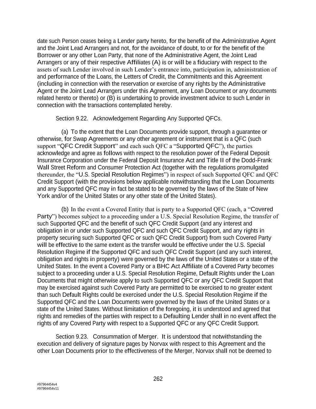 262 #97964454v4 #97964454v11 date such Person ceases being a Lender party hereto, for the benefit of the Administrative Agent and the Joint Lead Arrangers and not, for the avoidance of doubt, to or for the benefit of the Borrower or any other Loan Party, that none of the Administrative Agent, the Joint Lead Arrangers or any of their respective Affiliates (A) is or will be a fiduciary with respect to the assets of such Lender involved in such Lender’s entrance into, participation in, administration of and performance of the Loans, the Letters of Credit, the Commitments and this Agreement (including in connection with the reservation or exercise of any rights by the Administrative Agent or the Joint Lead Arrangers under this Agreement, any Loan Document or any documents related hereto or thereto) or (B) is undertaking to provide investment advice to such Lender in connection with the transactions contemplated hereby. Section 9.22. Acknowledgement Regarding Any Supported QFCs. (a) To the extent that the Loan Documents provide support, through a guarantee or otherwise, for Swap Agreements or any other agreement or instrument that is a QFC (such support “QFC Credit Support” and each such QFC a “Supported QFC”), the parties acknowledge and agree as follows with respect to the resolution power of the Federal Deposit Insurance Corporation under the Federal Deposit Insurance Act and Title II of the Dodd-Frank Wall Street Reform and Consumer Protection Act (together with the regulations promulgated thereunder, the “U.S. Special Resolution Regimes”) in respect of such Supported QFC and QFC Credit Support (with the provisions below applicable notwithstanding that the Loan Documents and any Supported QFC may in fact be stated to be governed by the laws of the State of New York and/or of the United States or any other state of the United States). (b) In the event a Covered Entity that is party to a Supported QFC (each, a “Covered Party”) becomes subject to a proceeding under a U.S. Special Resolution Regime, the transfer of such Supported QFC and the benefit of such QFC Credit Support (and any interest and obligation in or under such Supported QFC and such QFC Credit Support, and any rights in property securing such Supported QFC or such QFC Credit Support) from such Covered Party will be effective to the same extent as the transfer would be effective under the U.S. Special Resolution Regime if the Supported QFC and such QFC Credit Support (and any such interest, obligation and rights in property) were governed by the laws of the United States or a state of the United States. In the event a Covered Party or a BHC Act Affiliate of a Covered Party becomes subject to a proceeding under a U.S. Special Resolution Regime, Default Rights under the Loan Documents that might otherwise apply to such Supported QFC or any QFC Credit Support that may be exercised against such Covered Party are permitted to be exercised to no greater extent than such Default Rights could be exercised under the U.S. Special Resolution Regime if the Supported QFC and the Loan Documents were governed by the laws of the United States or a state of the United States. Without limitation of the foregoing, it is understood and agreed that rights and remedies of the parties with respect to a Defaulting Lender shall in no event affect the rights of any Covered Party with respect to a Supported QFC or any QFC Credit Support. Section 9.23. Consummation of Merger. It is understood that notwithstanding the execution and delivery of signature pages by Norvax with respect to this Agreement and the other Loan Documents prior to the effectiveness of the Merger, Norvax shall not be deemed to