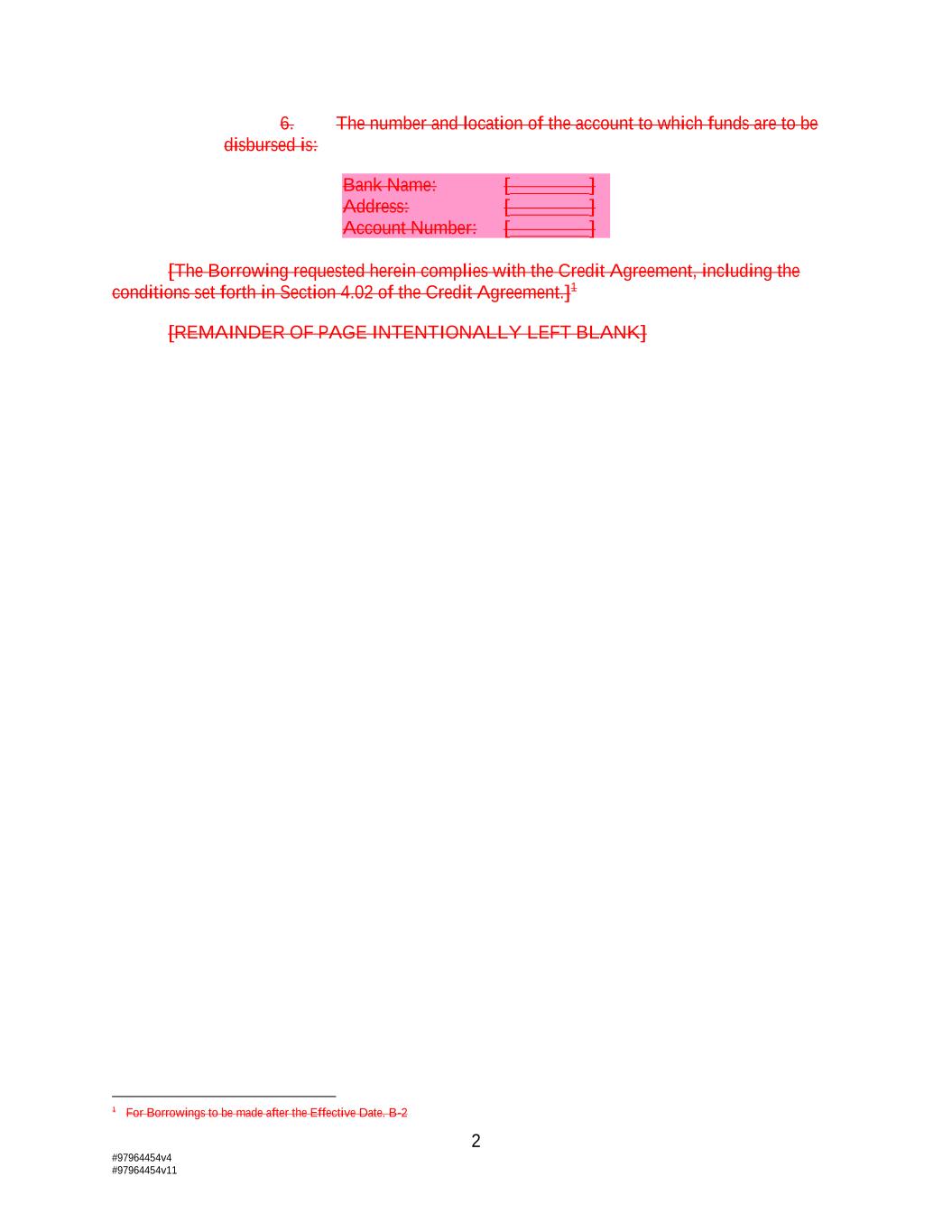2 #97964454v4 #97964454v11 6. The number and location of the account to which funds are to be disbursed is: Bank Name: [ ] Address: [ ] Account Number: [ ] [The Borrowing requested herein complies with the Credit Agreement, including the conditions set forth in Section 4.02 of the Credit Agreement.]1 [REMAINDER OF PAGE INTENTIONALLY LEFT BLANK] 1 For Borrowings to be made after the Effective Date. B-2