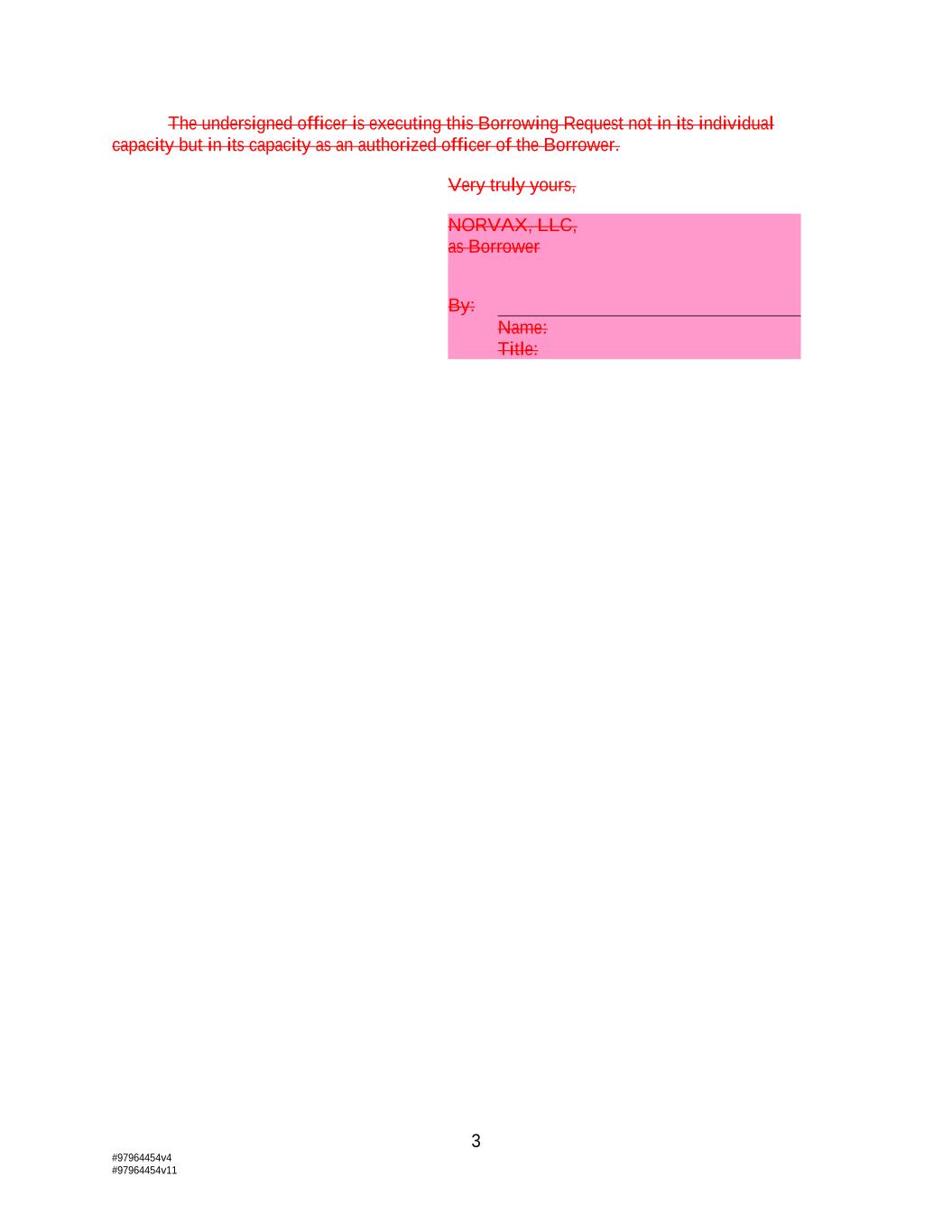3 #97964454v4 #97964454v11 The undersigned officer is executing this Borrowing Request not in its individual capacity but in its capacity as an authorized officer of the Borrower. Very truly yours, NORVAX, LLC, as Borrower By: Name: Title: