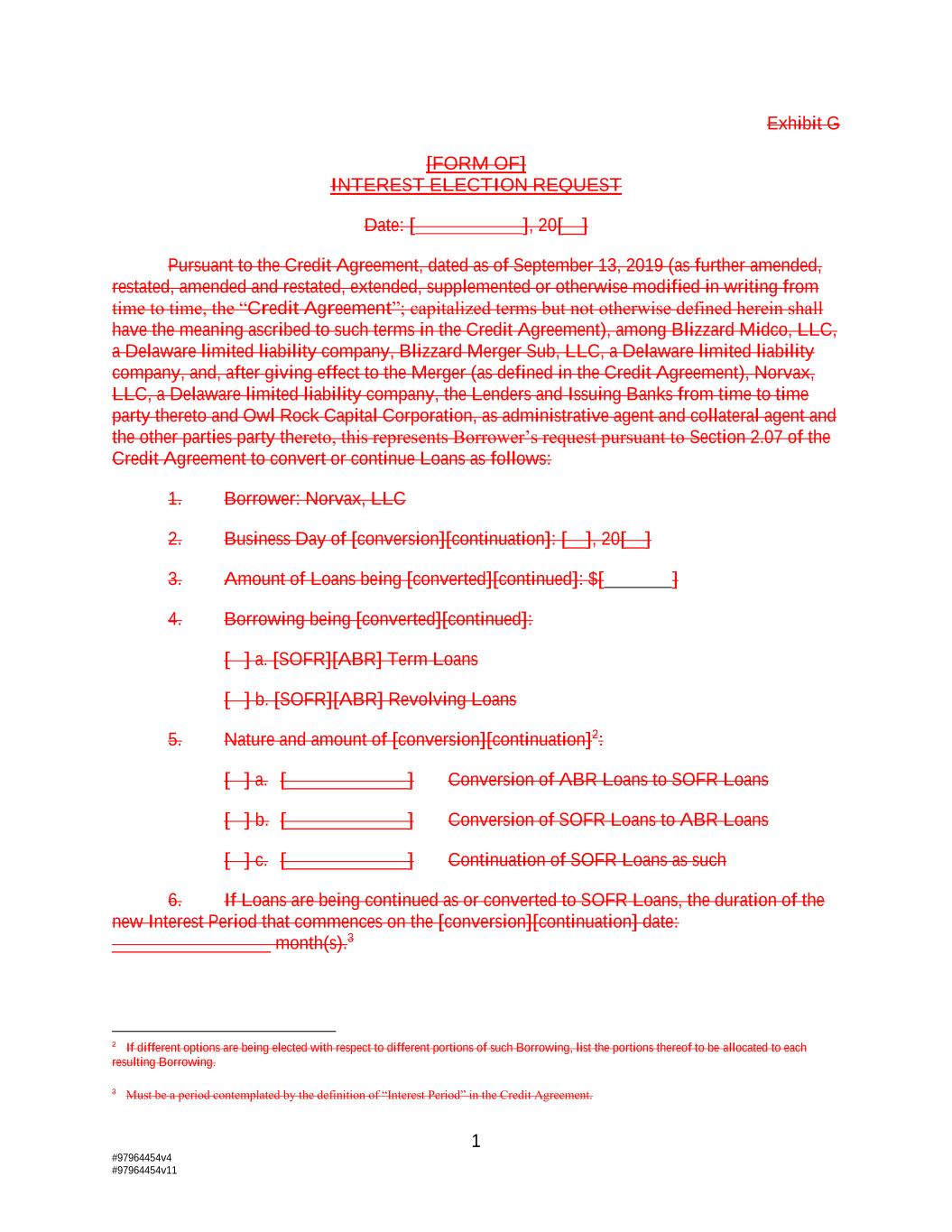 1 #97964454v4 #97964454v11 Exhibit G [FORM OF] INTEREST ELECTION REQUEST Date: [ ], 20[__] Pursuant to the Credit Agreement, dated as of September 13, 2019 (as further amended, restated, amended and restated, extended, supplemented or otherwise modified in writing from time to time, the “Credit Agreement”; capitalized terms but not otherwise defined herein shall have the meaning ascribed to such terms in the Credit Agreement), among Blizzard Midco, LLC, a Delaware limited liability company, Blizzard Merger Sub, LLC, a Delaware limited liability company, and, after giving effect to the Merger (as defined in the Credit Agreement), Norvax, LLC, a Delaware limited liability company, the Lenders and Issuing Banks from time to time party thereto and Owl Rock Capital Corporation, as administrative agent and collateral agent and the other parties party thereto, this represents Borrower’s request pursuant to Section 2.07 of the Credit Agreement to convert or continue Loans as follows: 1. Borrower: Norvax, LLC 2. Business Day of [conversion][continuation]: [__], 20[__] 3. Amount of Loans being [converted][continued]: $[ ] 4. Borrowing being [converted][continued]: [ ] a. [SOFR][ABR] Term Loans [ ] b. [SOFR][ABR] Revolving Loans 5. Nature and amount of [conversion][continuation]2: [ ] a. [_____________] Conversion of ABR Loans to SOFR Loans [ ] b. [_____________] Conversion of SOFR Loans to ABR Loans [ ] c. [_____________] Continuation of SOFR Loans as such 6. If Loans are being continued as or converted to SOFR Loans, the duration of the new Interest Period that commences on the [conversion][continuation] date: _________________ month(s).3 2 If different options are being elected with respect to different portions of such Borrowing, list the portions thereof to be allocated to each resulting Borrowing. 3 Must be a period contemplated by the definition of “Interest Period” in the Credit Agreement.