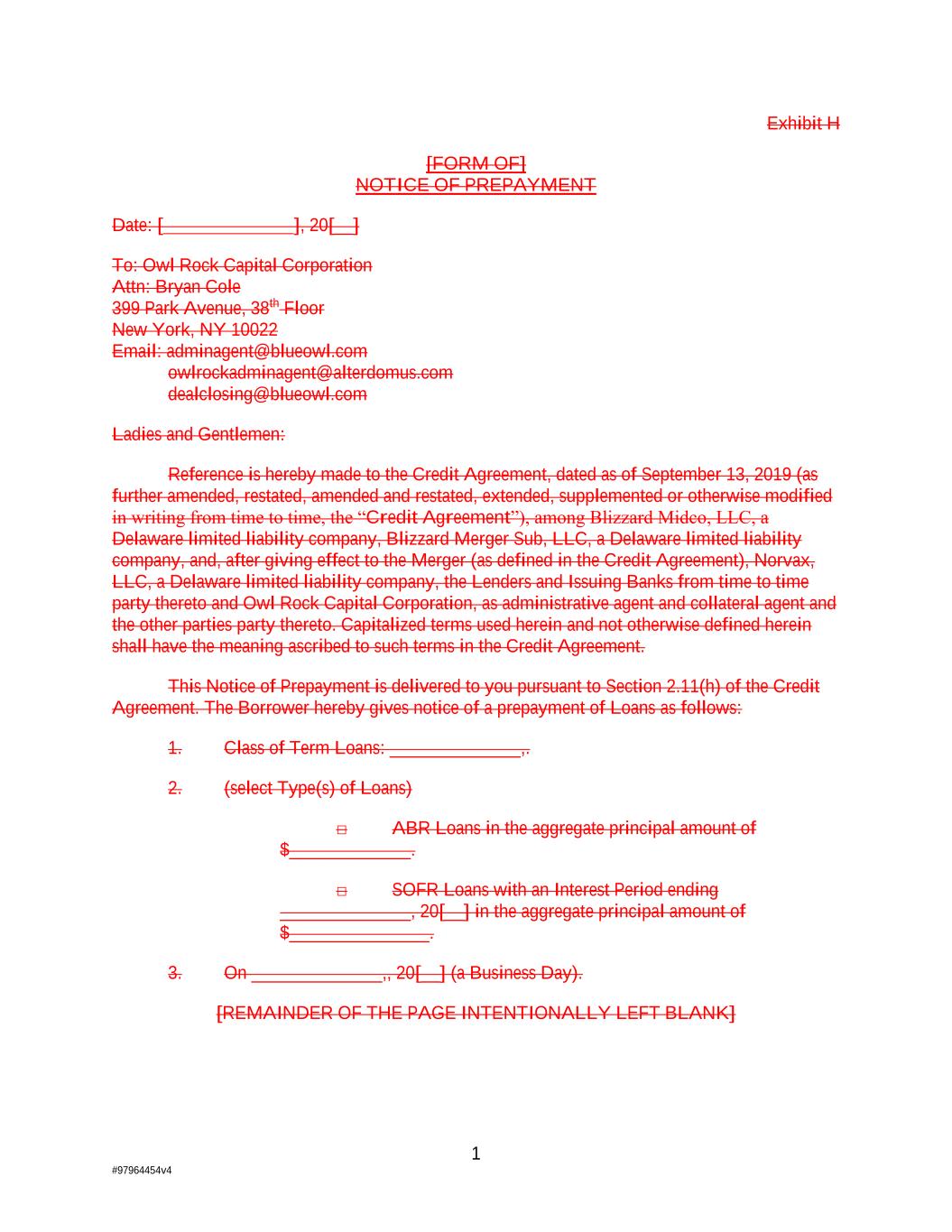 1 #97964454v4 Exhibit H [FORM OF] NOTICE OF PREPAYMENT Date: [ ], 20[__] To: Owl Rock Capital Corporation Attn: Bryan Cole 399 Park Avenue, 38th Floor New York, NY 10022 Email: adminagent@blueowl.com owlrockadminagent@alterdomus.com dealclosing@blueowl.com Ladies and Gentlemen: Reference is hereby made to the Credit Agreement, dated as of September 13, 2019 (as further amended, restated, amended and restated, extended, supplemented or otherwise modified in writing from time to time, the “Credit Agreement”), among Blizzard Midco, LLC, a Delaware limited liability company, Blizzard Merger Sub, LLC, a Delaware limited liability company, and, after giving effect to the Merger (as defined in the Credit Agreement), Norvax, LLC, a Delaware limited liability company, the Lenders and Issuing Banks from time to time party thereto and Owl Rock Capital Corporation, as administrative agent and collateral agent and the other parties party thereto. Capitalized terms used herein and not otherwise defined herein shall have the meaning ascribed to such terms in the Credit Agreement. This Notice of Prepayment is delivered to you pursuant to Section 2.11(h) of the Credit Agreement. The Borrower hereby gives notice of a prepayment of Loans as follows: 1. Class of Term Loans: ______________,. 2. (select Type(s) of Loans) □ ABR Loans in the aggregate principal amount of $_____________. □ SOFR Loans with an Interest Period ending ______________, 20[__] in the aggregate principal amount of $_______________. 3. On ______________,, 20[__] (a Business Day). [REMAINDER OF THE PAGE INTENTIONALLY LEFT BLANK]