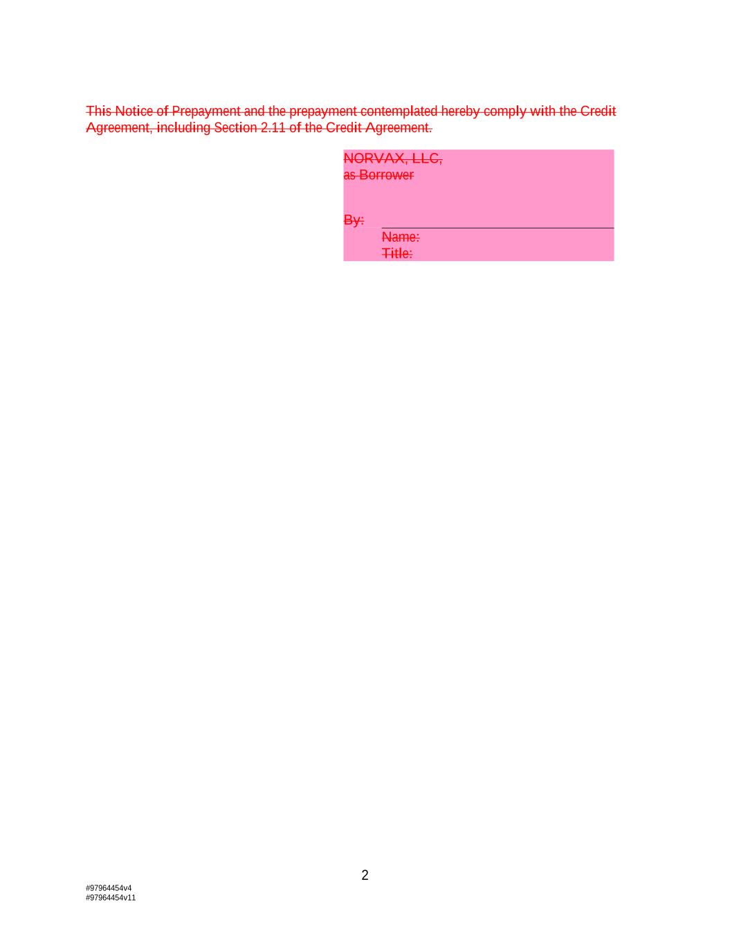 2 #97964454v4 #97964454v11 This Notice of Prepayment and the prepayment contemplated hereby comply with the Credit Agreement, including Section 2.11 of the Credit Agreement. NORVAX, LLC, as Borrower By: Name: Title: