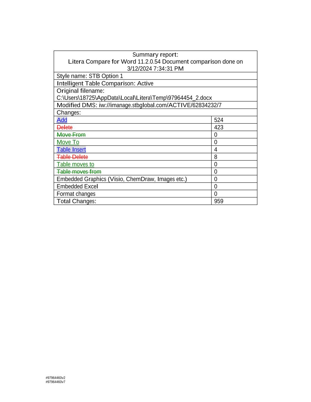 #97964460v2 #97964460v7 Summary report: Litera Compare for Word 11.2.0.54 Document comparison done on 3/12/2024 7:34:31 PM Style name: STB Option 1 Intelligent Table Comparison: Active Original filename: C:\Users\18725\AppData\Local\Litera\Temp\97964454_2.docx Modified DMS: iw://imanage.stbglobal.com/ACTIVE/62834232/7 Changes: Add 524 Delete 423 Move From 0 Move To 0 Table Insert 4 Table Delete 8 Table moves to 0 Table moves from 0 Embedded Graphics (Visio, ChemDraw, Images etc.) 0 Embedded Excel 0 Format changes 0 Total Changes: 959