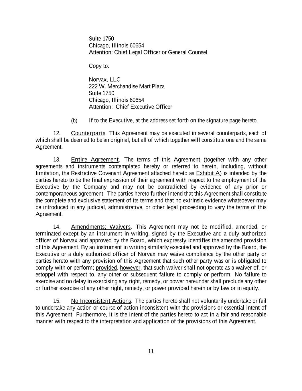11 Suite 1750 Chicago, Illinois 60654 Attention: Chief Legal Officer or General Counsel Copy to: Norvax, LLC 222 W. Merchandise Mart Plaza Suite 1750 Chicago, Illinois 60654 Attention: Chief Executive Officer (b) If to the Executive, at the address set forth on the signature page hereto. 12. Counterparts. This Agreement may be executed in several counterparts, each of which shall be deemed to be an original, but all of which together will constitute one and the same Agreement. 13. Entire Agreement. The terms of this Agreement (together with any other agreements and instruments contemplated hereby or referred to herein, including, without limitation, the Restrictive Covenant Agreement attached hereto as Exhibit A) is intended by the parties hereto to be the final expression of their agreement with respect to the employment of the Executive by the Company and may not be contradicted by evidence of any prior or contemporaneous agreement. The parties hereto further intend that this Agreement shall constitute the complete and exclusive statement of its terms and that no extrinsic evidence whatsoever may be introduced in any judicial, administrative, or other legal proceeding to vary the terms of this Agreement. 14. Amendments; Waivers. This Agreement may not be modified, amended, or terminated except by an instrument in writing, signed by the Executive and a duly authorized officer of Norvax and approved by the Board, which expressly identifies the amended provision of this Agreement. By an instrument in writing similarly executed and approved by the Board, the Executive or a duly authorized officer of Norvax may waive compliance by the other party or parties hereto with any provision of this Agreement that such other party was or is obligated to comply with or perform; provided, however, that such waiver shall not operate as a waiver of, or estoppel with respect to, any other or subsequent failure to comply or perform. No failure to exercise and no delay in exercising any right, remedy, or power hereunder shall preclude any other or further exercise of any other right, remedy, or power provided herein or by law or in equity. 15. No Inconsistent Actions. The parties hereto shall not voluntarily undertake or fail to undertake any action or course of action inconsistent with the provisions or essential intent of this Agreement. Furthermore, it is the intent of the parties hereto to act in a fair and reasonable manner with respect to the interpretation and application of the provisions of this Agreement.