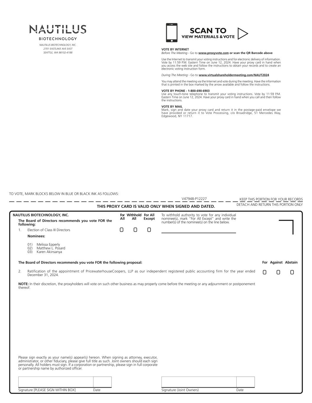 Signature [PLEASE SIGN WITHIN BOX] Date Signature (Joint Owners) Date TO VOTE, MARK BLOCKS BELOW IN BLUE OR BLACK INK AS FOLLOWS: KEEP THIS PORTION FOR YOUR RECORDS DETACH AND RETURN THIS PORTION ONLYTHIS PROXY CARD IS VALID ONLY WHEN SIGNED AND DATED. V47948-P12227 Nominees: 01) Melissa Epperly 02) Matthew L. Posard 03) Karen Akinsanya 2. Ratification of the appointment of PricewaterhouseCoopers, LLP as our independent registered public accounting firm for the year ended December 31, 2024. ! ! !1. Election of Class III Directors For All Withhold All For All Except Please sign exactly as your name(s) appear(s) hereon. When signing as attorney, executor, administrator, or other fiduciary, please give full title as such. Joint owners should each sign personally. All holders must sign. If a corporation or partnership, please sign in full corporate or partnership name by authorized officer. NAUTILUS BIOTECHNOLOGY, INC. To withhold authority to vote for any individual nominee(s), mark "For All Except" and write the number(s) of the nominee(s) on the line below.The Board of Directors recommends you vote FOR the following: The Board of Directors recommends you vote FOR the following proposal: NOTE: In their discretion, the proxyholders will vote on such other business as may properly come before the meeting or any adjournment or postponement thereof. For Against Abstain NAUTILUS BIOTECHNOLOGY, INC. 2701 EASTLAKE AVE EAST SEATTLE, WA 98102-4188 ! !! VOTE BY INTERNET Before The Meeting - Go to www.proxyvote.com or scan the QR Barcode above Use the Internet to transmit your voting instructions and for electronic delivery of information. Vote by 11:59 P.M. Eastern Time on June 12, 2024. Have your proxy card in hand when you access the web site and follow the instructions to obtain your records and to create an electronic voting instruction form. During The Meeting - Go to www.virtualshareholdermeeting.com/NAUT2024 You may attend the meeting via the Internet and vote during the meeting. Have the information that is printed in the box marked by the arrow available and follow the instructions. VOTE BY PHONE - 1-800-690-6903 Use any touch-tone telephone to transmit your voting instructions. Vote by 11:59 P.M. Eastern Time on June 12, 2024. Have your proxy card in hand when you call and then follow the instructions. VOTE BY MAIL Mark, sign and date your proxy card and return it in the postage-paid envelope we have provided or return it to Vote Processing, c/o Broadridge, 51 Mercedes Way, Edgewood, NY 11717. SCAN TO VIEW MATERIALS & VOTEw