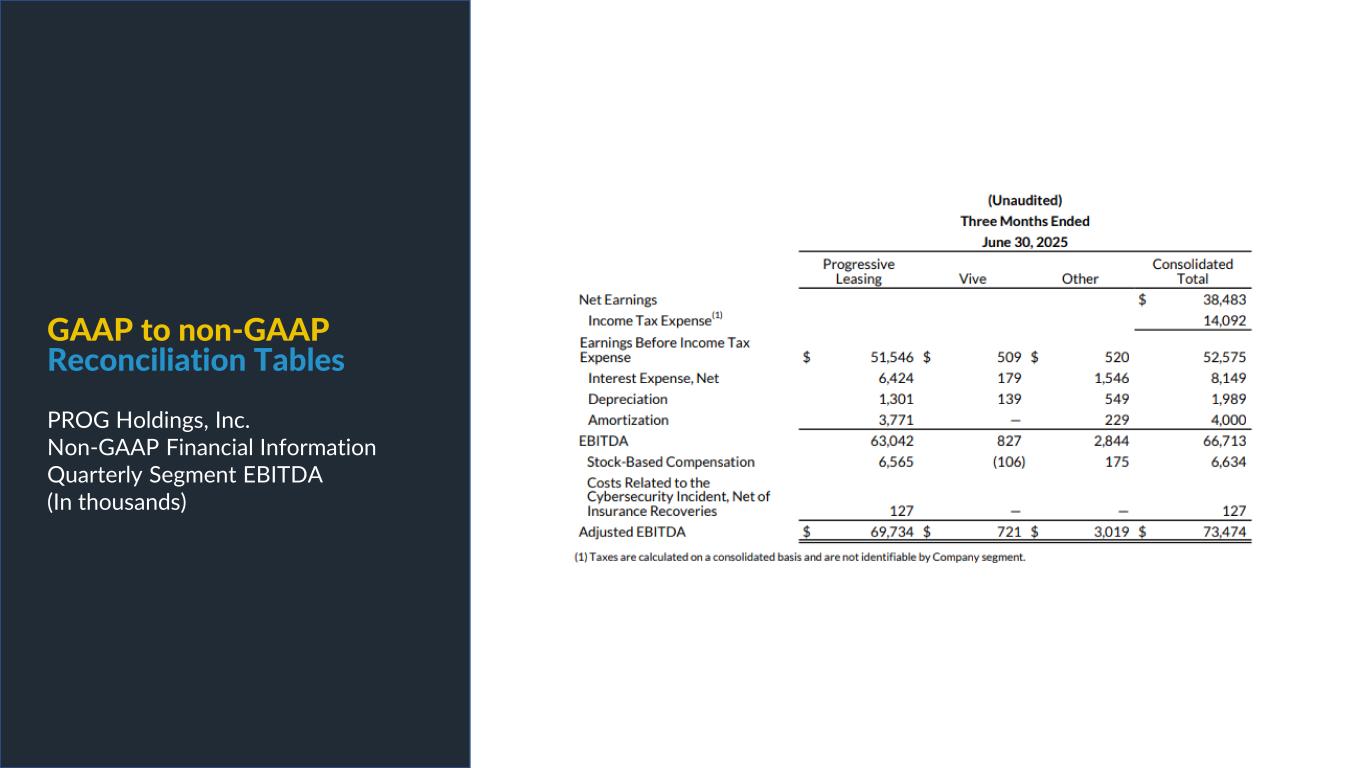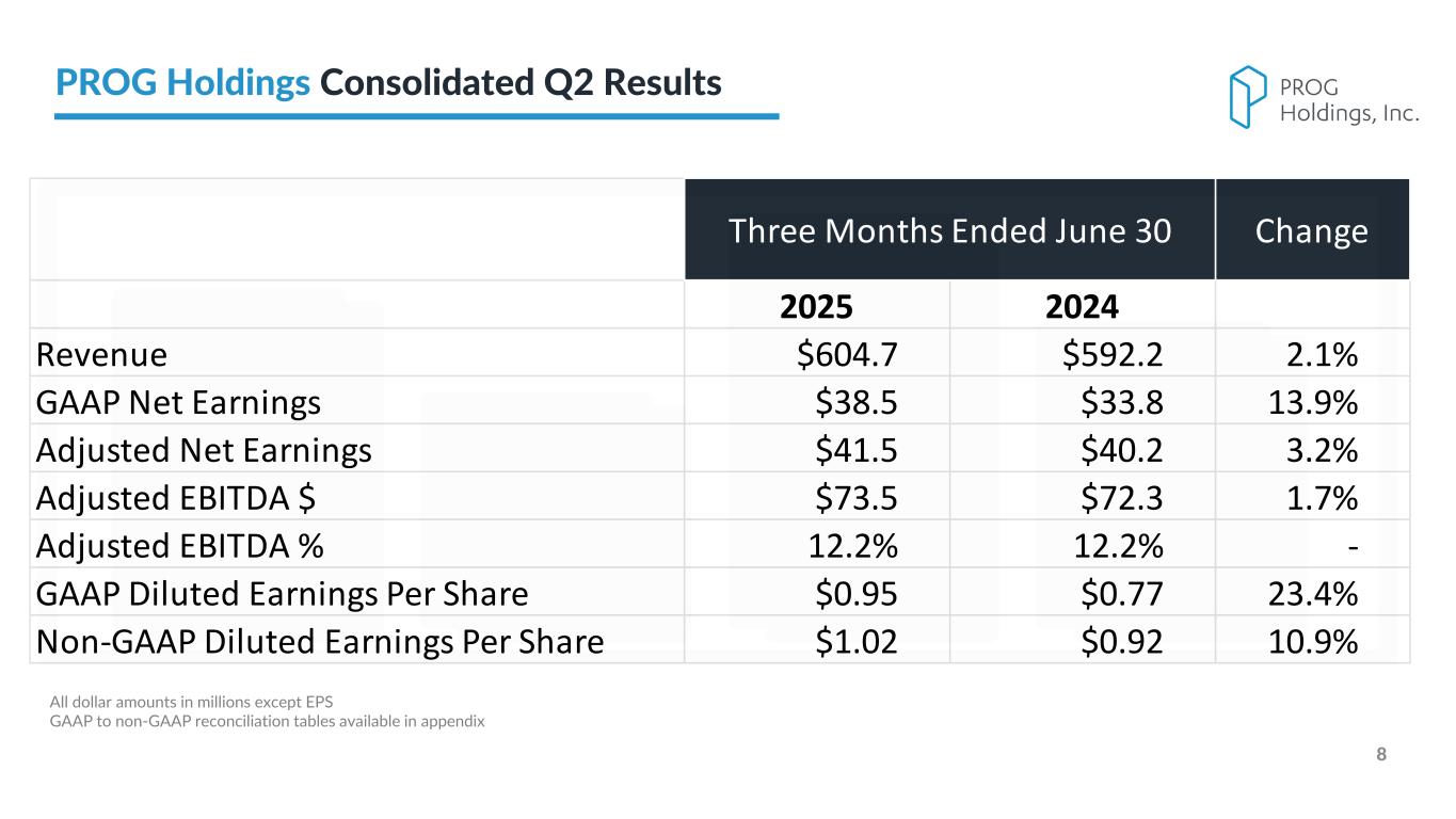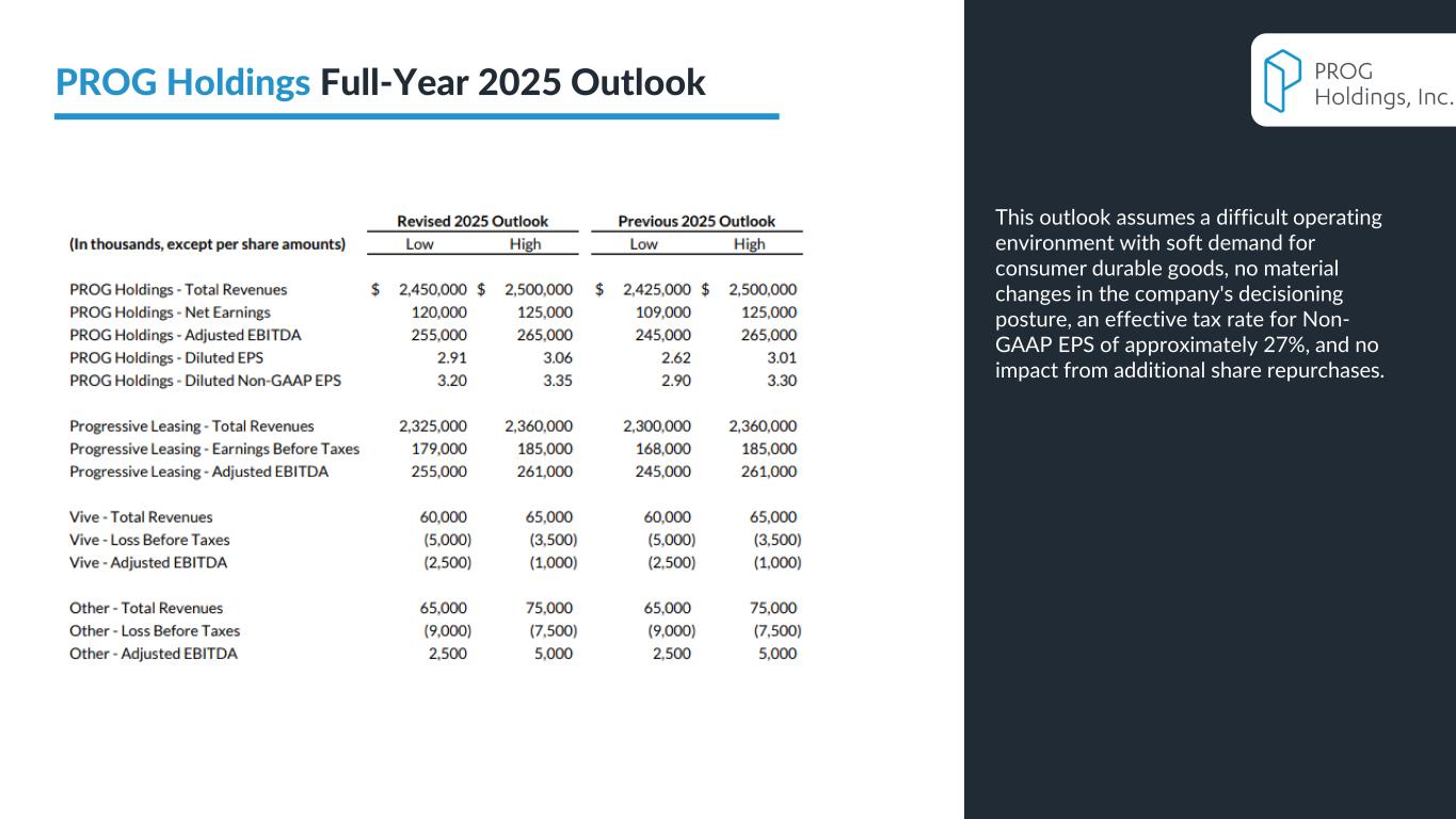 PROG Internal 4 “Our second quarter results once again demonstrate the resiliency of our Leasing business and our ability to manage through a period of high uncertainty and the loss of an important retail partner to liquidation” said Steve Michaels, President and CEO of PROG Holdings. “The revenue and earnings outperformance compared to guidance reflects strong execution in our Progressive Leasing business, where our teams took deliberate actions to preserve portfolio health while expanding balance of share with key retail partners - even as we navigated notable GMV headwinds. At the same time, Four Technologies delivered another outstanding quarter, with over 200% revenue growth and continued profitability. Four is delivering value to our ecosystem - driving cross-sell opportunities and enhancing customer engagement across our platform.” “At Progressive Leasing, we’re advancing our technology initiatives - deploying AI-powered tools, optimizing our digital funnel, and enhancing our mobile and web experiences to create a more seamless, personalized customer journey. These improvements are driving greater efficiency and top-of-the funnel engagement, even as we make strategic decisions to moderate GMV growth and maintain portfolio performance within our targeted annual write-off range to fulfill our expectation of sustainable and profitable growth.” “I am extremely proud of our team’s execution as we strike the balance of executing on growth objectives in our Progressive Leasing business and further developing our other suite of products which holds significant promise,” Michaels concluded. Steve Michaels President and CEO, PROG Holdings, Inc. PROG Holdings Executive Commentary