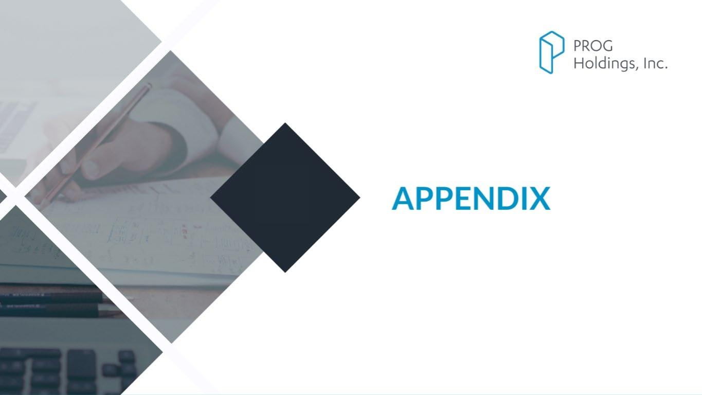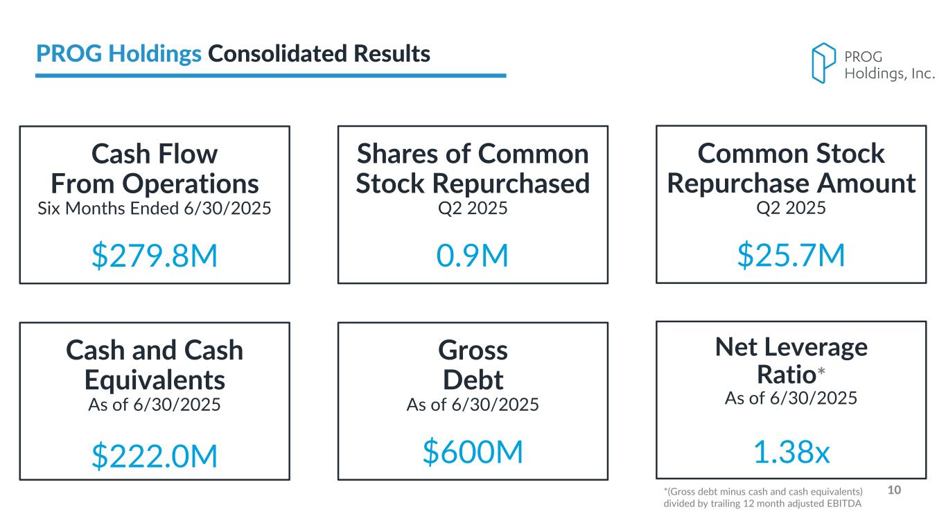 PROG Internal 10*(Gross debt minus cash and cash equivalents) divided by trailing 12 month adjusted EBITDA PROG Holdings Consolidated Results Shares of Common Stock Repurchased Q2 2025 0.9M Cash and Cash Equivalents As of 6/30/2025 $222.0M Gross Debt As of 6/30/2025 $600M Net Leverage Ratio* As of 6/30/2025 1.38x Cash Flow From Operations Six Months Ended 6/30/2025 $279.8M Common Stock Repurchase Amount Q2 2025 $25.7M