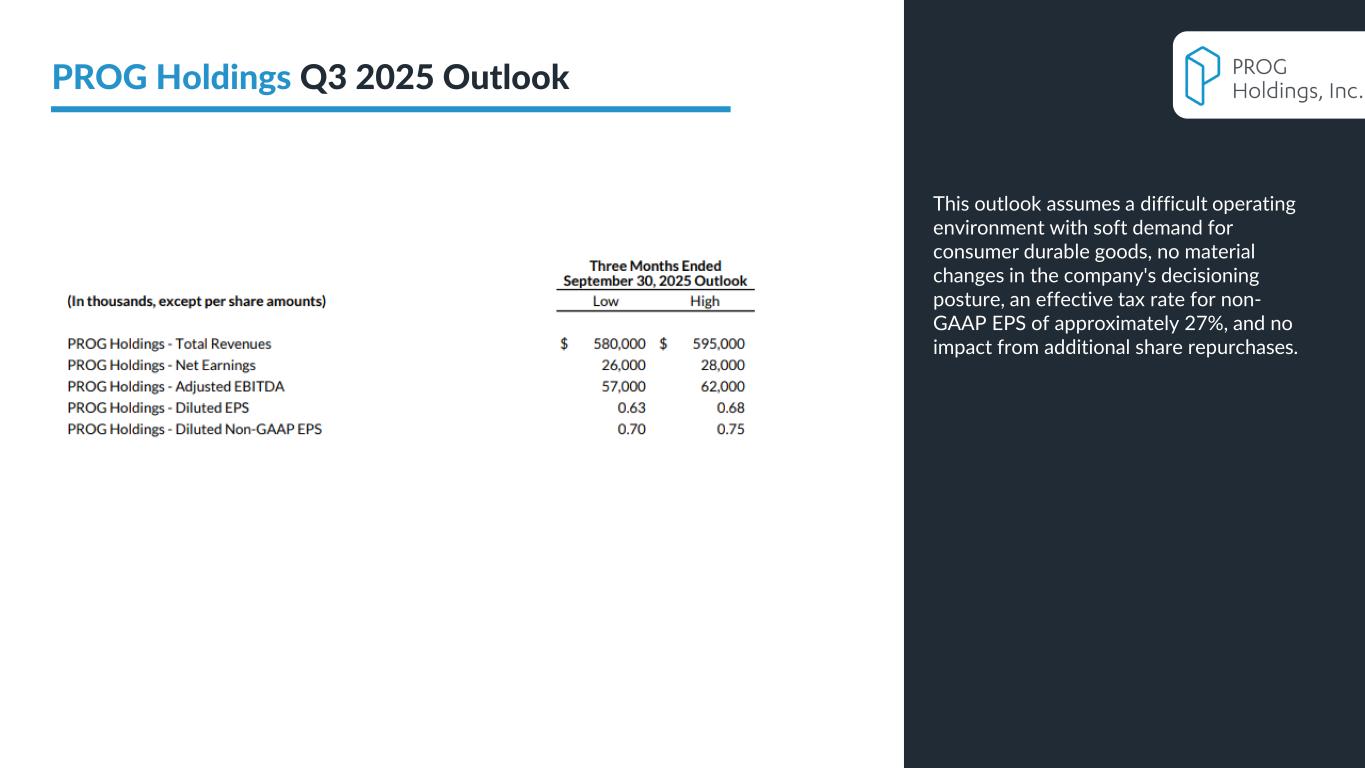 PROG Internal 12 PROG Holdings Q3 2025 Outlook This outlook assumes a difficult operating environment with soft demand for consumer durable goods, no material changes in the company's decisioning posture, an effective tax rate for non- GAAP EPS of approximately 27%, and no impact from additional share repurchases.