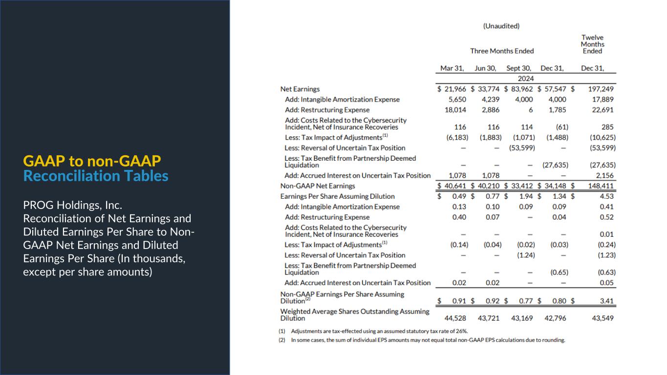 PROG Internal GAAP to non-GAAP Reconciliation Tables PROG Holdings, Inc. Reconciliation of Net Earnings and Diluted Earnings Per Share to Non- GAAP Net Earnings and Diluted Earnings Per Share (In thousands, except per share amounts)