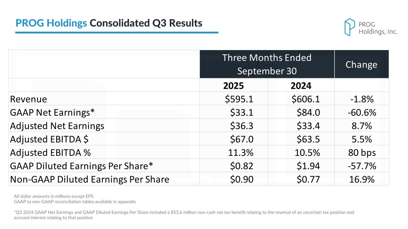 PROG Internal 2025 2024 Revenue $595.1 $606.1 -1.8% GAAP Net Earnings* $33.1 $84.0 -60.6% Adjusted Net Earnings $36.3 $33.4 8.7% Adjusted EBITDA $ $67.0 $63.5 5.5% Adjusted EBITDA % 11.3% 10.5% 80 bps GAAP Diluted Earnings Per Share* $0.82 $1.94 -57.7% Non-GAAP Diluted Earnings Per Share $0.90 $0.77 16.9% Three Months Ended September 30 Change All dollar amounts in millions except EPS GAAP to non-GAAP reconciliation tables available in appendix *Q3 2024 GAAP Net Earnings and GAAP Diluted Earnings Per Share included a $53.6 million non-cash net tax benefit relating to the reversal of an uncertain tax position and accrued interest relating to that position PROG Holdings Consolidated Q3 Results