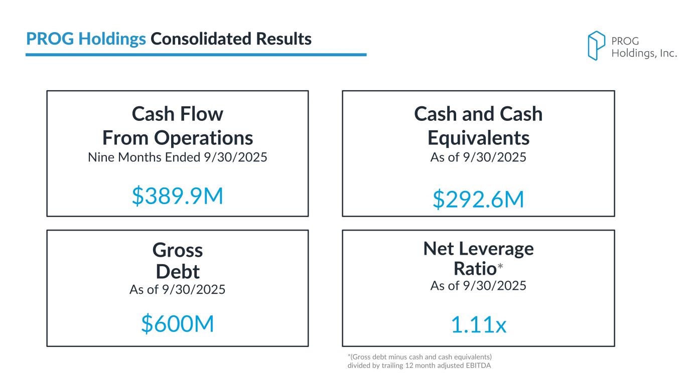 PROG Internal *(Gross debt minus cash and cash equivalents) divided by trailing 12 month adjusted EBITDA PROG Holdings Consolidated Results Cash and Cash Equivalents As of 9/30/2025 $292.6M Gross Debt As of 9/30/2025 $600M Net Leverage Ratio* As of 9/30/2025 1.11x Cash Flow From Operations Nine Months Ended 9/30/2025 $389.9M