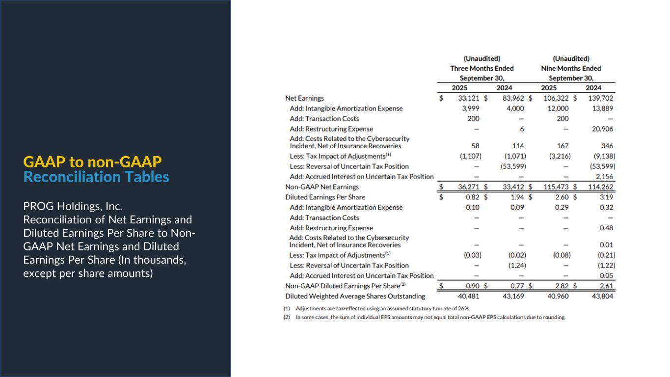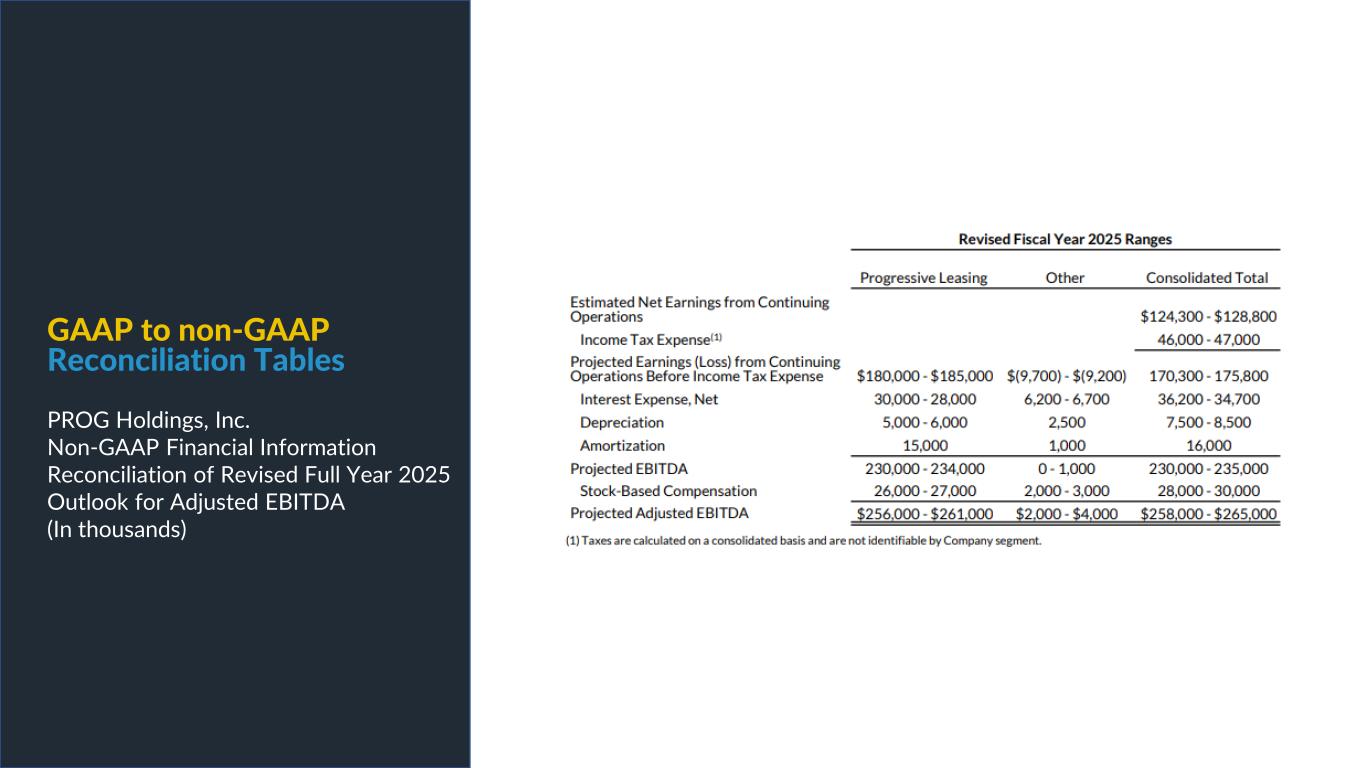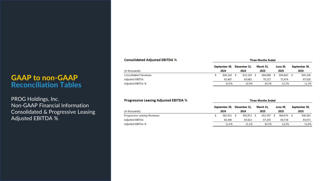 PROG Internal Non-GAAP net earnings, non-GAAP diluted earnings per share, and adjusted EBITDA are supplemental measures of our performance that are not calculated in accordance with generally accepted accounting principles in the United States ("GAAP"). Non-GAAP diluted earnings per share from continuing operations for the full year 2025 and fourth quarter 2025 outlook excludes intangible amortization expense and also excludes Vive as its normal operations have been discontinued as a result of the sale of its credit card portfolio in October 2025. The Vive segment will be presented as discontinued operations beginning in the fourth quarter of 2025. Adjusted EBITDA excludes Vive's operations as well as the gain on the sale of the credit card portfolio. Non-GAAP net earnings and non-GAAP diluted earnings per share for the three and nine months ended September 30, 2025, exclude intangible amortization expense, transaction costs and costs related to the cybersecurity incident, net of insurance recoveries. Non-GAAP net earnings and non-GAAP diluted earnings per share for the three and nine months ended September 30, 2024 exclude intangible amortization expense, restructuring expenses, costs related to the cybersecurity incident, and reversal of the uncertain tax position related to Progressive Leasing’s $175 million settlement with the FTC in 2020. The amount for the after-tax non-GAAP adjustment, which is tax effected using our statutory tax rate, can be found in the reconciliation of net earnings and diluted earnings per share to non-GAAP net earnings and diluted earnings per share table in this presentation. The Adjusted EBITDA figures presented in this presentation are calculated as the Company’s earnings before interest expense, net, depreciation on property and equipment, amortization of intangible assets and income taxes. Adjusted EBITDA for the full year 2025 and fourth quarter 2025 outlook excludes stock-based compensation expense. Adjusted EBITDA for the three and nine months ended September 30, 2025 excludes stock-based compensation expense, costs related to the cybersecurity incident, net of insurance recoveries and transaction costs. Adjusted EBITDA for the three and nine months ended September 30, 2024 excludes stock-based compensation expense, restructuring expenses, and costs related to the cybersecurity incident, net of insurance recoveries. The amounts for these pre-tax non-GAAP adjustments can be found in the segment EBITDA tables in this presentation. Management believes that non-GAAP net earnings, non-GAAP diluted earnings per share, and adjusted EBITDA provide relevant and useful information, and are widely used by analysts, investors and competitors in our industry as well as by our management in assessing both consolidated and business unit performance. Non-GAAP net earnings, non-GAAP diluted earnings, and adjusted EBITDA provide management and investors with an understanding of the results from the primary operations of our business by excluding the effects of certain items that generally arose from larger, one-time transactions that are not reflective of the ordinary earnings activity of our operations or transactions that have variability and volatility of the amount. We believe the exclusion of stock-based compensation expense provides for a better comparison of our operating results with our peer companies as the calculations of stock-based compensation vary from period to period and company to company due to different valuation methodologies, subjective assumptions and the variety of award types. This measure may be useful to an investor in evaluating the underlying operating performance of our business. Adjusted EBITDA also provides management and investors with an understanding of one aspect of earnings before the impact of investing and financing charges and income taxes. These measures may be useful to an investor in evaluating our operating performance because the measures: • Are widely used by investors to measure a company’s operating performance without regard to items excluded from the calculation of such measure, which can vary substantially from company to company depending upon accounting methods, book value of assets, capital structure and the method by which assets were acquired, among other factors. • Are used by rating agencies, lenders and other parties to evaluate our creditworthiness. • Are used by our management for various purposes, including as a measure of performance of our operating entities and as a basis for strategic planning and forecasting. Non-GAAP financial measures, however, should not be used as a substitute for, or considered superior to, measures of financial performance prepared in accordance with GAAP, such as the Company’s GAAP basis net earnings and diluted earnings per share and the GAAP revenues and earnings before income taxes of the Company’s segments, which are also included in the presentation. Further, we caution investors that amounts presented in accordance with our definitions of non-GAAP net earnings, non-GAAP diluted earnings per share, and adjusted EBITDA may not be comparable to similar measures disclosed by other companies, because not all companies and analysts calculate these measures in the same manner. Use of Non-GAAP Financial Measures