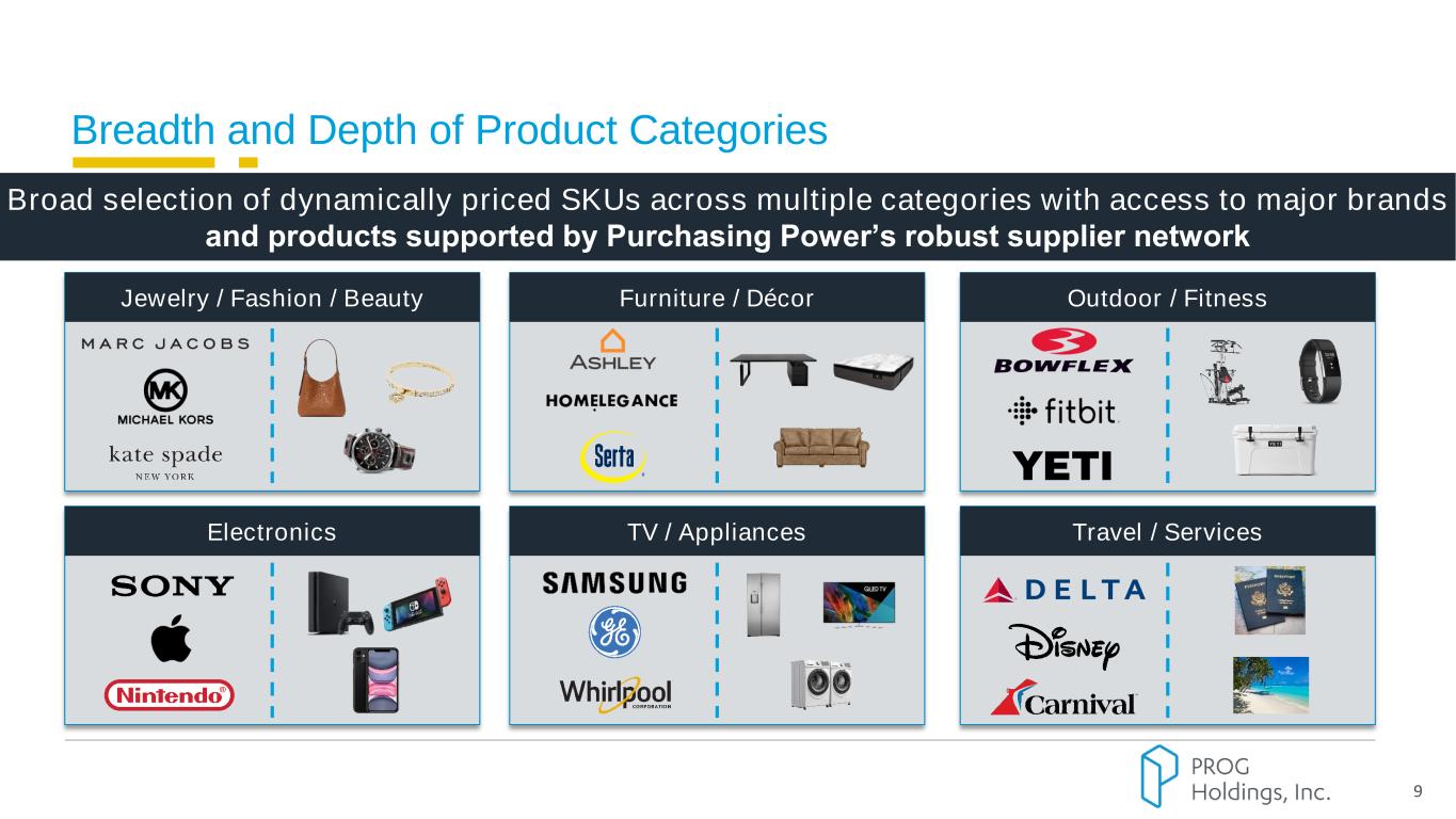 PROG Internal Compelling Value Proposition to Clients and Customers 8 ~7mm+ eligible employees ~54% female / ~46% male; ~48 average age(2) ~80% of customers have <650 Credit Score Median household income of ~$78K(2) 360+ established employers, focusing on companies in industries with stable employee populations / low turnover and public sector-related employers Target employers with over 1K employees; average client has ~15K employees Diverse industry representation Sticky, embedded relationships; 98% client revenue retention rate(1) (1) For a given year, represents the % of revenue from clients who joined the platform prior to the current year. (2) Metrics are based on 1Q25 Experian Data. Benefit for Clients Eases financial stress and improves productivity Increases employee loyalty / retention Improves employee morale and job satisfaction Results in a free benefit at no cost to the employer Benefit for Customers Spending power known upfront Transparent, affordable payments Vast selection of brand name products and services Reduces financial stress Convenient payment method Client Base Customer Base