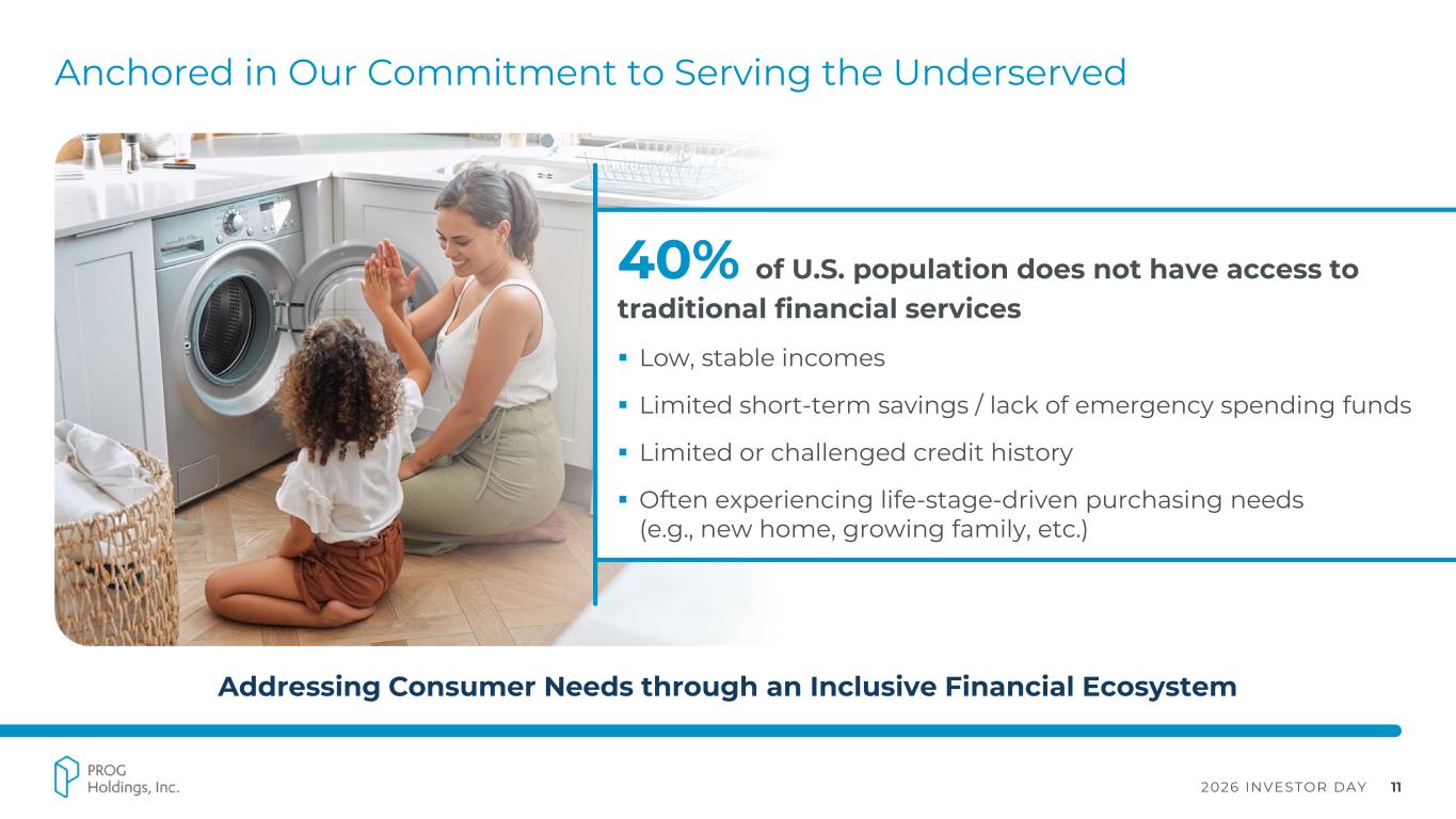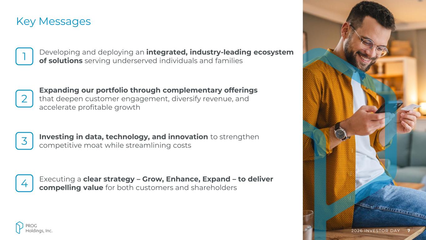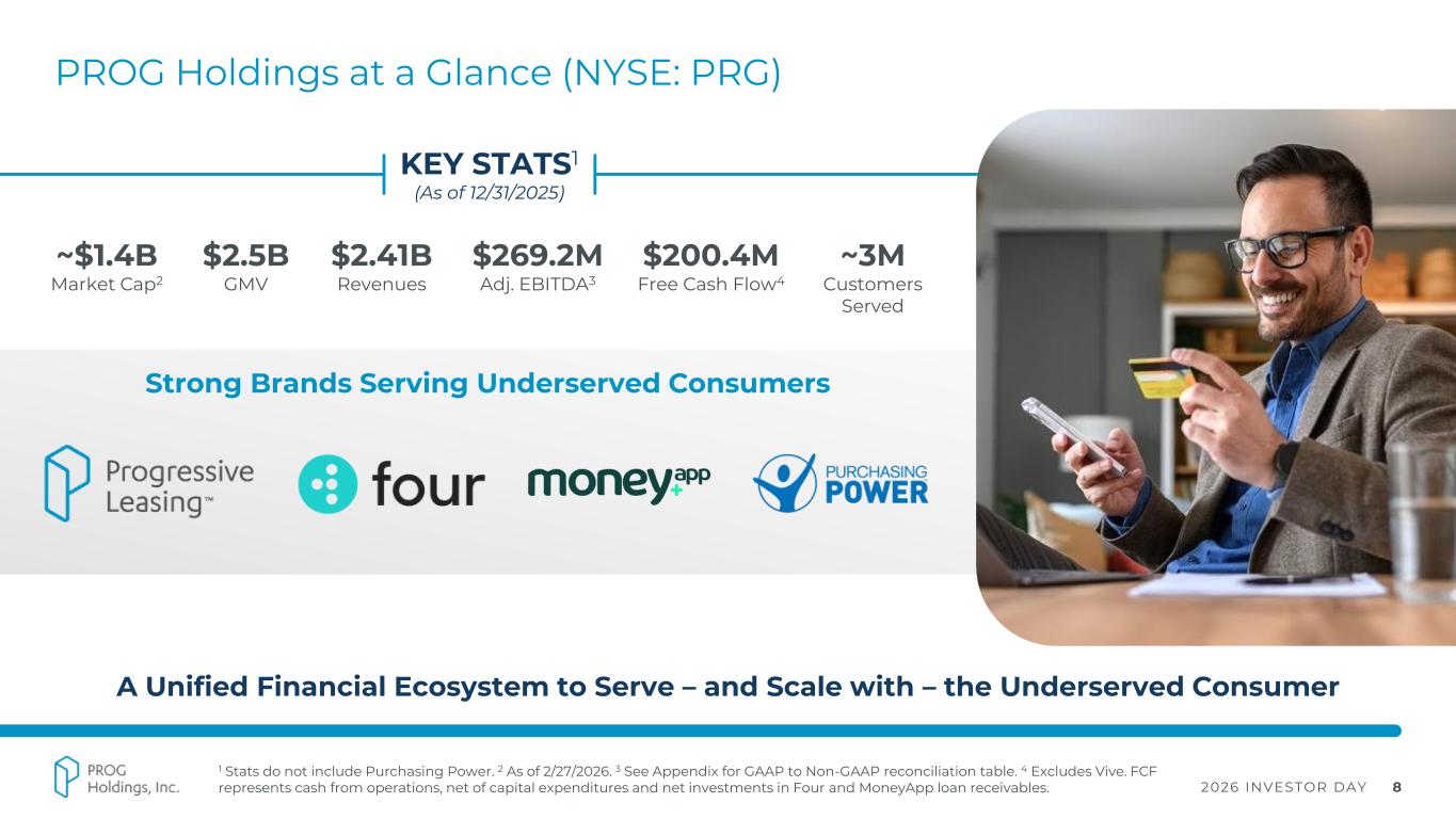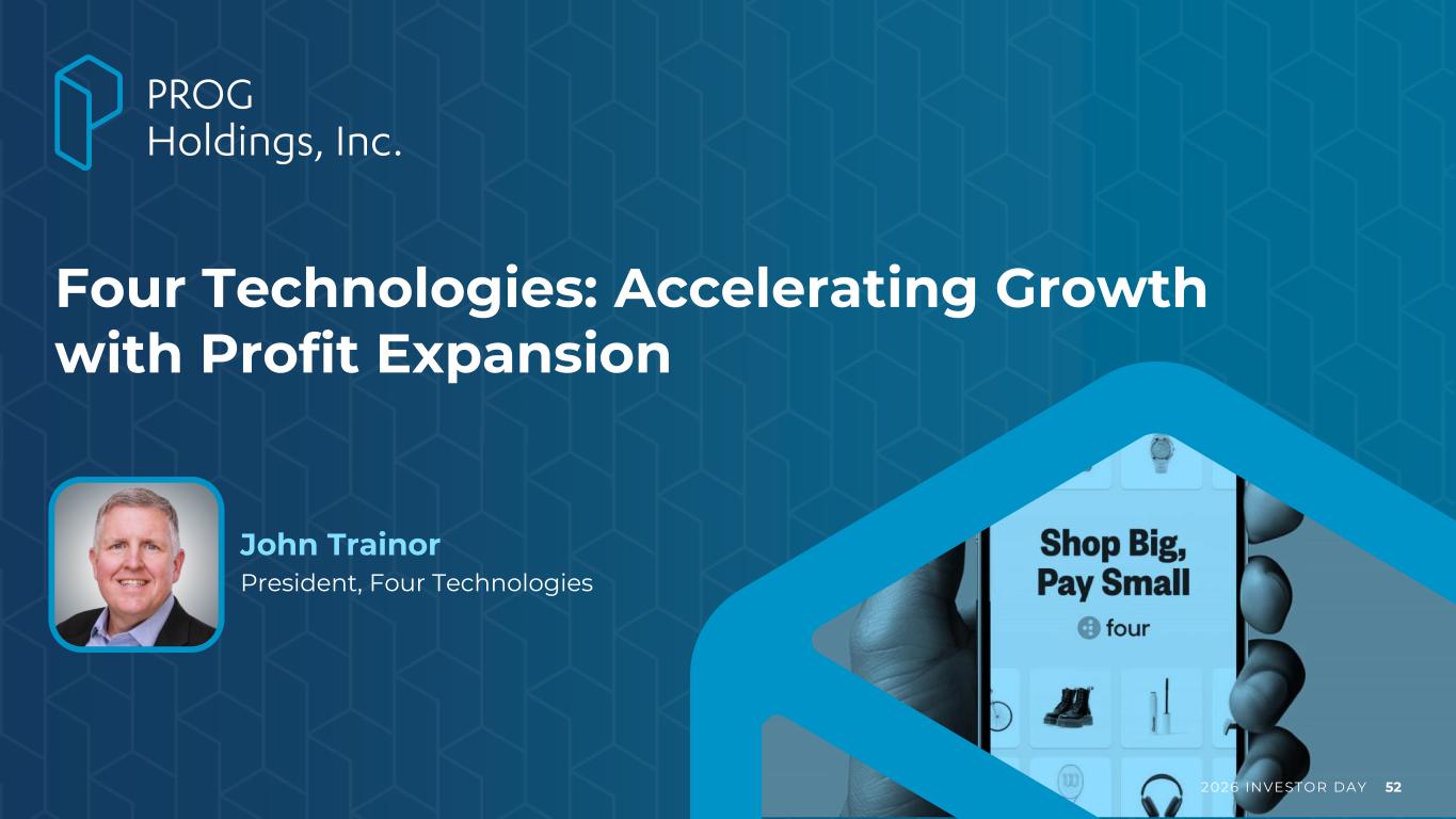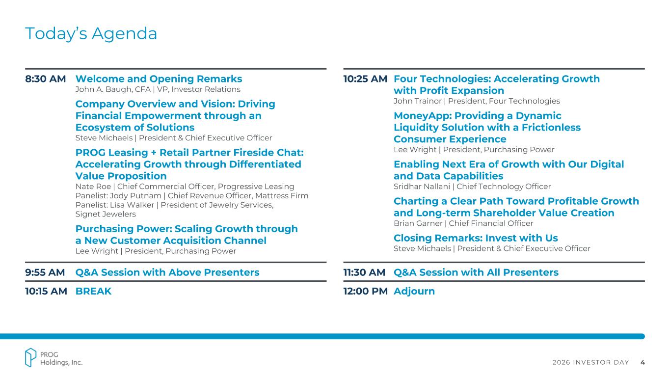 2026 INVESTOR DAY 3 Forward Looking Statements Statements in this presentation regarding PROG Holdings, Inc.’s (the “Company”) businesses, operations and performance that are not historical facts are "forward-looking statements" that involve risks and uncertainties which could cause actual results to differ materially from those contained in the forward-looking statements. Such forward-looking statements generally can be identified by the use of forward-looking terminology, such as “expect”, “outlook”, “targets” and similar forward-looking terminology. These risks and uncertainties include those discussed under "Risk Factors" in the Company’s Annual Report on Form 10-K for the fiscal year ended December 31, 2025, filed with the SEC on February 18, 2026. Statements in this presentation that are forward-looking include statements about: (i) the Company’s ability to grow profitably and create long-term value for its shareholders; (ii) the benefits the Company expects from its acquisition of Purchasing Power and from its Four and MoneyApp businesses; (iii) the future performance of Progressive Leasing, including with respect to its direct-to-consumer and other GMV growth initiatives and the health of its lease portfolio; (iv) the advancement of the Company’s technology initiatives and the benefits expected from them; (v) the Company’s 2026 outlook; and (vii) the Company’s three-year performance targets. You are cautioned not to place undue reliance on these forward-looking statements, which speak only as of the date of this presentation. Except as required by law, the Company undertakes no obligation to update these forward-looking statements to reflect subsequent events or circumstances after the date of this presentation.