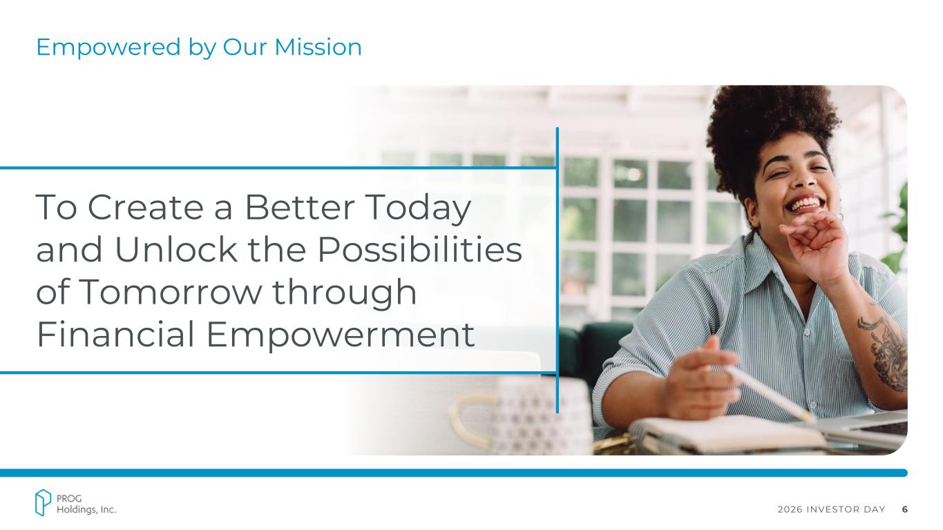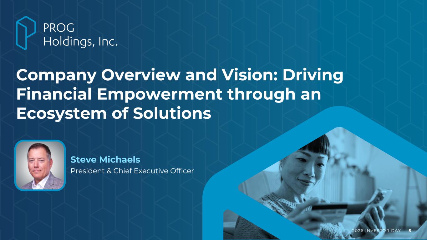 2026 INVESTOR DAY 4 8:30 AM Welcome and Opening Remarks John A. Baugh, CFA | VP, Investor Relations Company Overview and Vision: Driving Financial Empowerment through an Ecosystem of Solutions Steve Michaels | President & Chief Executive Officer PROG Leasing + Retail Partner Fireside Chat: Accelerating Growth through Differentiated Value Proposition Nate Roe | Chief Commercial Officer, Progressive Leasing Panelist: Jody Putnam | Chief Revenue Officer, Mattress Firm Panelist: Lisa Walker | President of Jewelry Services, Signet Jewelers Purchasing Power: Scaling Growth through a New Customer Acquisition Channel Lee Wright | President, Purchasing Power 9:55 AM Q&A Session with Above Presenters 10:15 AM BREAK 10:25 AM Four Technologies: Accelerating Growth with Profit Expansion John Trainor | President, Four Technologies MoneyApp: Providing a Dynamic Liquidity Solution with a Frictionless Consumer Experience Lee Wright | President, Purchasing Power Enabling Next Era of Growth with Our Digital and Data Capabilities Sridhar Nallani | Chief Technology Officer Charting a Clear Path Toward Profitable Growth and Long-term Shareholder Value Creation Brian Garner | Chief Financial Officer Closing Remarks: Invest with Us Steve Michaels | President & Chief Executive Officer 11:30 AM Q&A Session with All Presenters 12:00 PM Adjourn Today’s Agenda