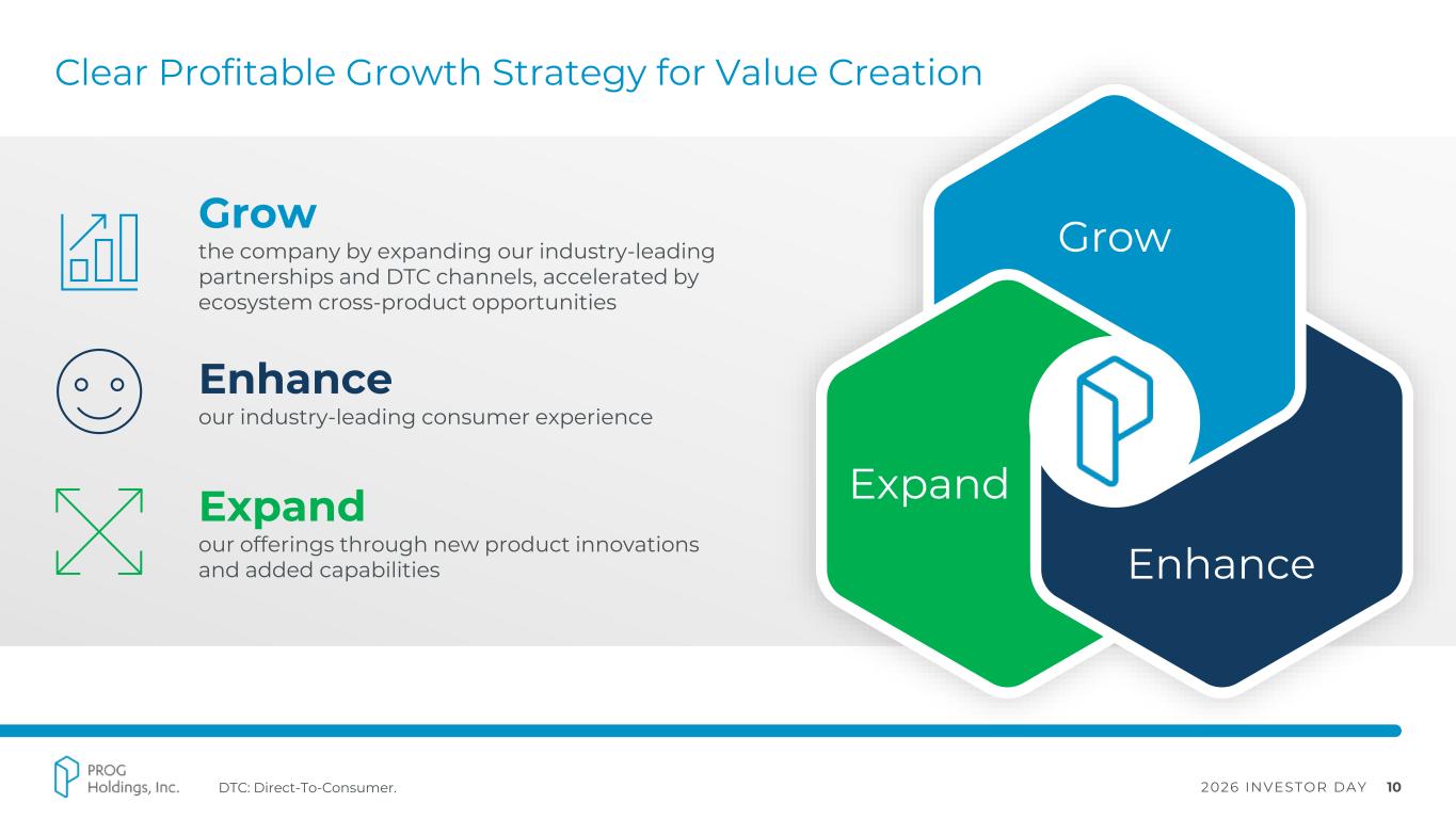 2026 INVESTOR DAY 9 Where We Are Going ▪ Building a unified financial ecosystem using cross-product data, decisioning, and customer insight ▪ Scaling ecosystem for a single consumer to engage with us across multiple products and life moments ▪ Unlocking cross-product growth through harmonized decisioning, driving higher customer lifetime value ▪ Expanding omni-channel distribution through national and regional retailers, employers, and growing DTC channel ▪ Scaling AI-enabled operating model that embeds more intelligence into the customer journey and improves customer lifetime value Our Transformation Journey Where We Have Been ▪ Successfully spun-out Aaron’s in 2020 ▪ Navigating dynamic market conditions and GMV pressure (macro / consumer headwinds) ▪ Strengthening and evolving the decisioning model ▪ Investing in new technologies to futureproof the organization ▪ Expanding the ecosystem of products offered Positioned for the Next Era of Growth and Profitability DTC: Direct-To-Consumer.