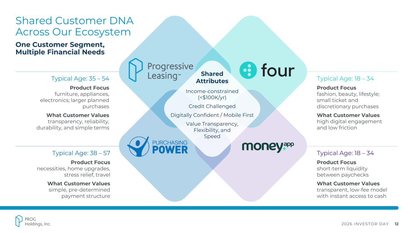 2026 INVESTOR DAY 11 Anchored in Our Commitment to Serving the Underserved Addressing Consumer Needs through an Inclusive Financial Ecosystem 40% of U.S. population does not have access to traditional financial services ▪ Low, stable incomes ▪ Limited short-term savings / lack of emergency spending funds ▪ Limited or challenged credit history ▪ Often experiencing life-stage-driven purchasing needs (e.g., new home, growing family, etc.)
