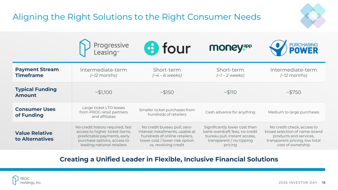 2026 INVESTOR DAY 12 Shared Customer DNA Across Our Ecosystem Typical Age: 35 – 54 Product Focus furniture, appliances, electronics; larger planned purchases What Customer Values transparency, reliability, durability, and simple terms Typical Age: 38 – 57 Product Focus necessities, home upgrades, stress relief, travel What Customer Values simple, pre-determined payment structure Typical Age: 18 – 34 Product Focus fashion, beauty, lifestyle; small ticket and discretionary purchases What Customer Values high digital engagement and low friction Typical Age: 18 – 34 Product Focus short-term liquidity between paychecks What Customer Values transparent, low-fee model with instant access to cash One Customer Segment, Multiple Financial Needs Shared Attributes Income-constrained (<$100K/yr) Credit Challenged Digitally Confident / Mobile First Value Transparency, Flexibility, and Speed