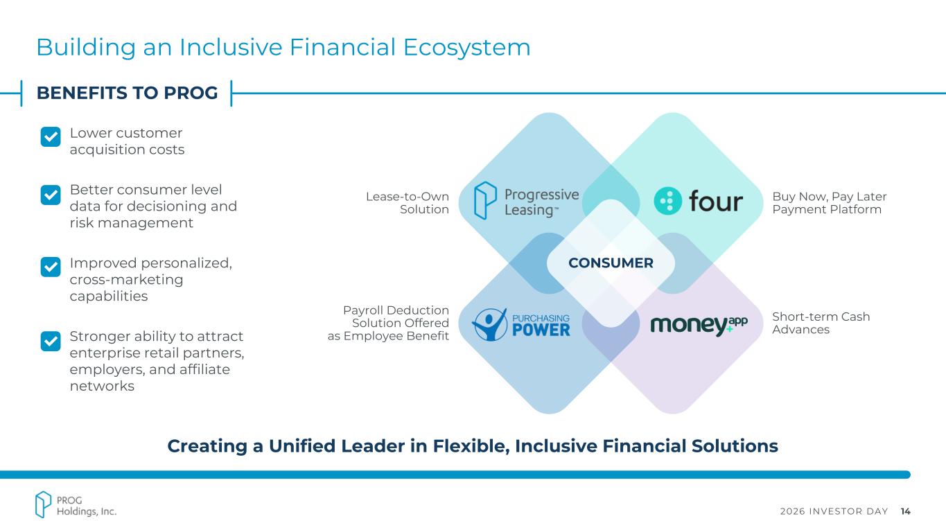 2026 INVESTOR DAY 13 Aligning the Right Solutions to the Right Consumer Needs Creating a Unified Leader in Flexible, Inclusive Financial Solutions Payment Stream Timeframe Intermediate-term (~12 months) Short-term (~4 – 6 weeks) Short-term (~1 – 2 weeks) Intermediate-term (~12 months) Typical Funding Amount ~$1,100 ~$150 ~$110 ~$750 Consumer Uses of Funding Large ticket LTO leases from PROG retail partners and affiliates Smaller ticket purchases from hundreds of retailers Cash advance for anything Medium to large purchases Value Relative to Alternatives No credit history required, fast access to higher-ticket items, predictable payments, early purchase options, access to leading national retailers No credit bureau pull, zero- interest installments, usable at hundreds of online retailers, lower-cost / lower-risk option vs. revolving credit Significantly lower cost than bank overdraft fees, no credit bureau pull, instant access, transparent / no-tipping pricing No credit check, access to broad selection of name-brand products and services, transparent pricing, low total cost of ownership