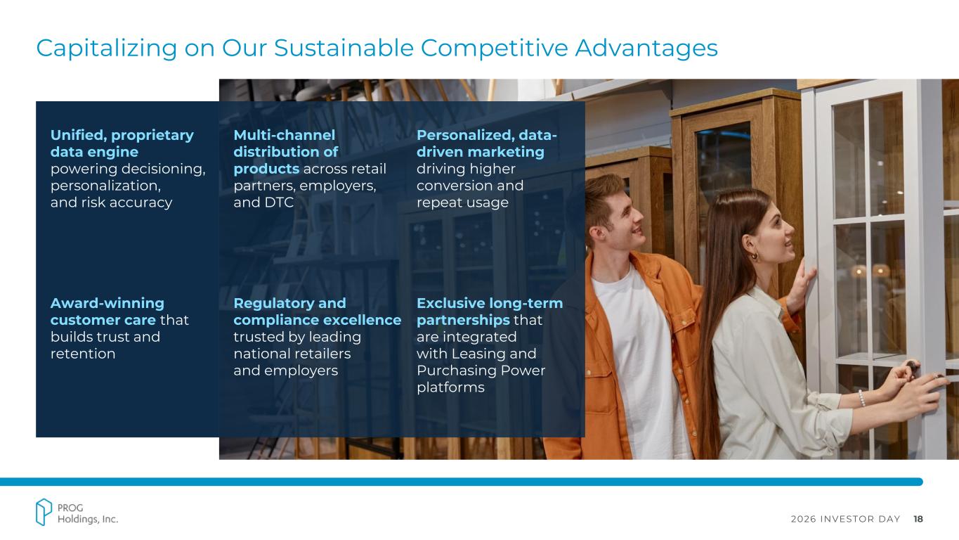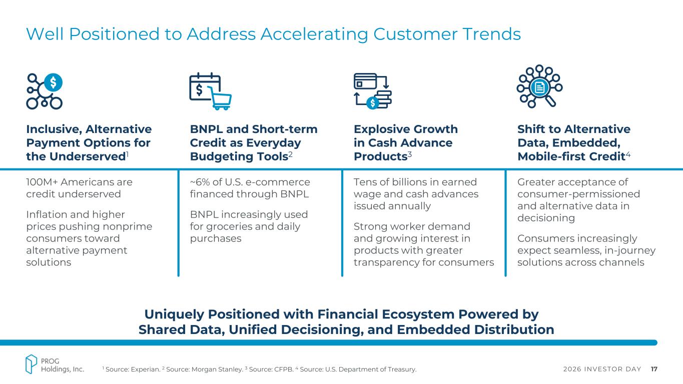 2026 INVESTOR DAY 16 Accelerating Our Approach with the Acquisition of Purchasing Power Purchase Price: $420M 2026 Adj. EBITDA1: $50M – 60M Double-digit % EPS Accretion2 Closed: January 2, 2026 A leading voluntary employee benefit program provider allowing employees to purchase brand-name products and services through either automatic payroll deductions or allotments Strategic Rationale ▪ Expands PROG’s ecosystem with a scalable payroll- deduction platform ▪ Unlocks a new, complementary consumer channel Brings Access to Complementary to Ecosystem ▪ Broadens payment-option portfolio by complementing existing offerings ▪ Creates cross-sell and upsell opportunities across our businesses ▪ Advances strategy to provide transparent and inclusive payment options to near and below-prime consumers 25+ Industries Served 1 See Appendix for non-GAAP definitions. 2 For FY 2026. 360+ Established Employer Clients 7M+ Eligible Employees Nationwide