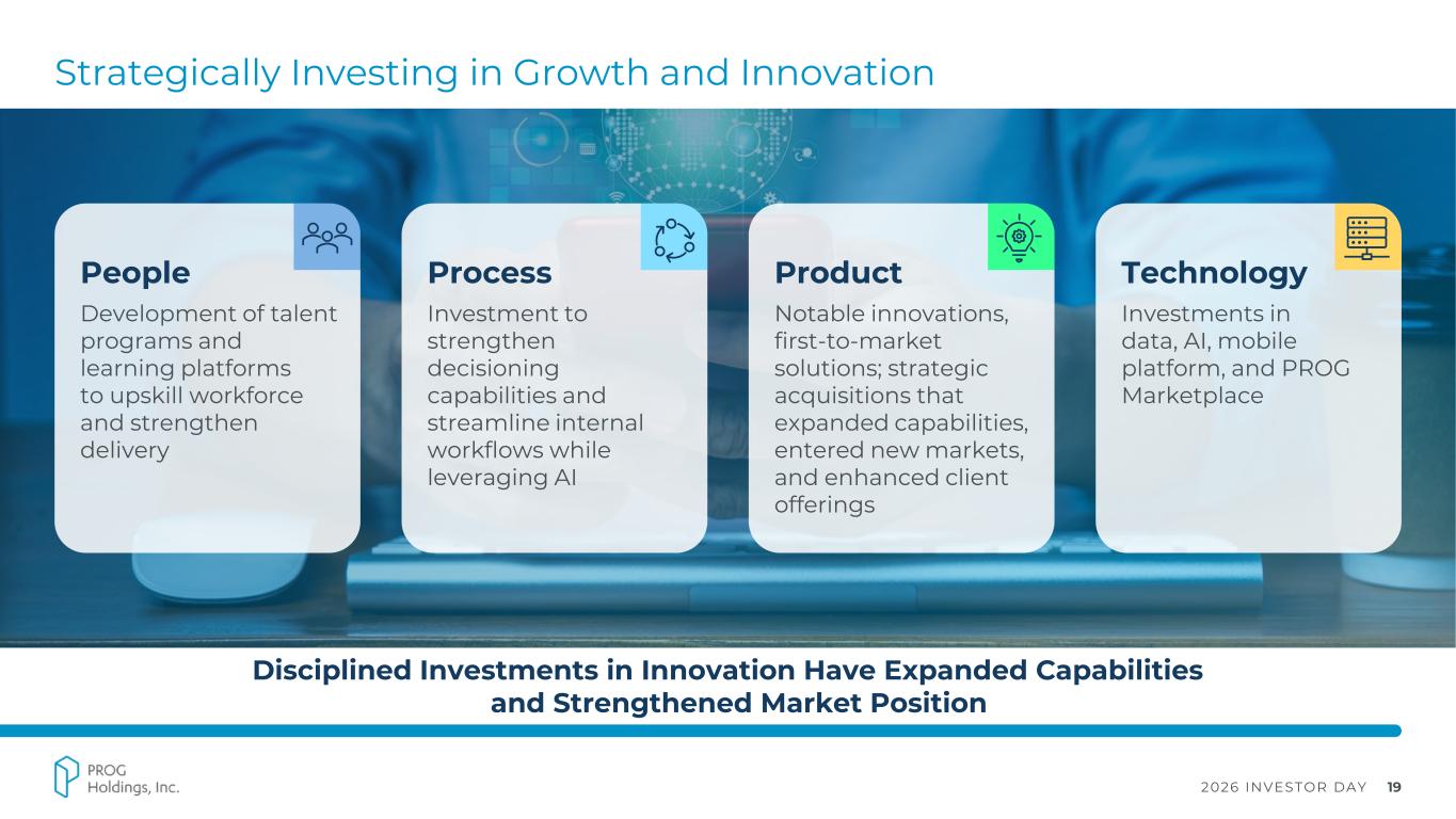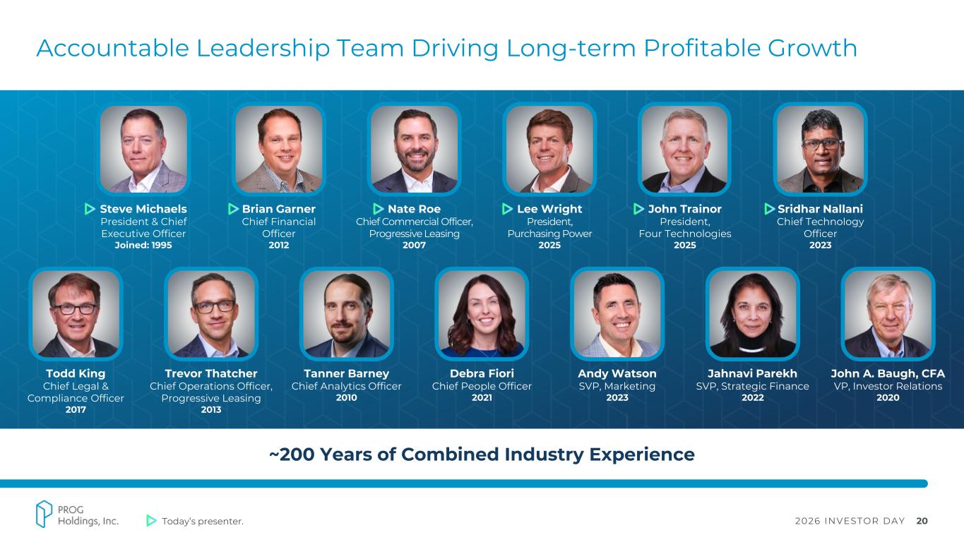 2026 INVESTOR DAY 19 Strategically Investing in Growth and Innovation Disciplined Investments in Innovation Have Expanded Capabilities and Strengthened Market Position Product Notable innovations, first-to-market solutions; strategic acquisitions that expanded capabilities, entered new markets, and enhanced client offerings People Development of talent programs and learning platforms to upskill workforce and strengthen delivery Process Investment to strengthen decisioning capabilities and streamline internal workflows while leveraging AI Technology Investments in data, AI, mobile platform, and PROG Marketplace