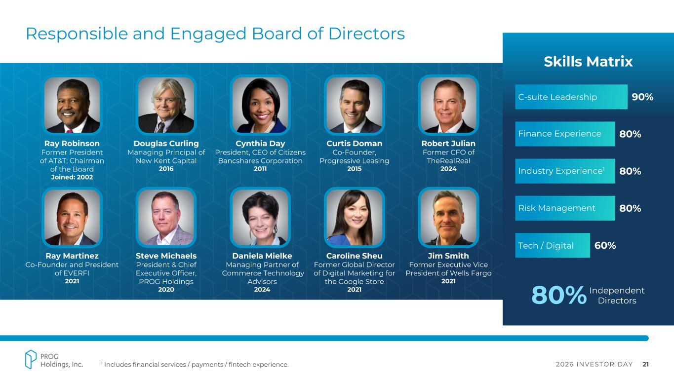2026 INVESTOR DAY 20 Accountable Leadership Team Driving Long-term Profitable Growth ~200 Years of Combined Industry Experience Debra Fiori Chief People Officer 2021 John A. Baugh, CFA VP, Investor Relations 2020 Trevor Thatcher Chief Operations Officer, Progressive Leasing 2013 Jahnavi Parekh SVP, Strategic Finance 2022 Andy Watson SVP, Marketing 2023 Today’s presenter. Todd King Chief Legal & Compliance Officer 2017 Steve Michaels President & Chief Executive Officer Joined: 1995 Brian Garner Chief Financial Officer 2012 Nate Roe Chief Commercial Officer, Progressive Leasing 2007 John Trainor President, Four Technologies 2025 Lee Wright President, Purchasing Power 2025 Sridhar Nallani Chief Technology Officer 2023 Tanner Barney Chief Analytics Officer 2010