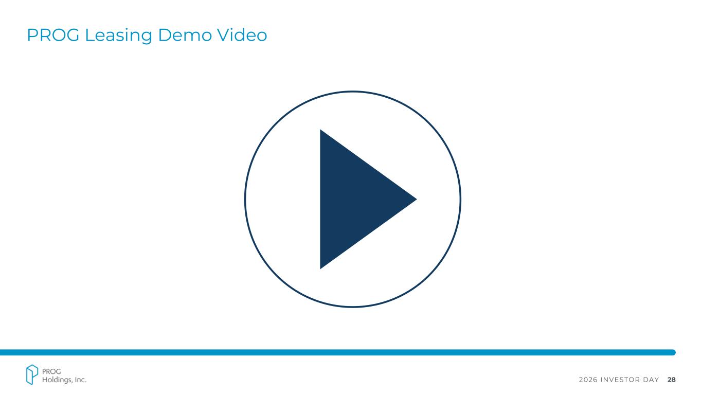 2026 INVESTOR DAY 27 How It Works 1 Apply: Available online, through Progressive’s mobile app, and in-store with select leading retailers Instant Decision: Decisions are issued within seconds of application submission Approved: Customers shop for leasable items of their choice – approvals good for up to 90 days Initial Payment: An initial payment will be collected when the customer signs the lease Take Items Home: Customers take items home same day or arrange for delivery Simple Payments: Optional auto payments managed by the customer via phone, online, or mobile app 2 5 Product Overview: Mechanics of PROG Leasing “Simple and fast, it literally took less than 5 minutes for the whole process.” PROG Leasing Customer Testimonial 3 4 6