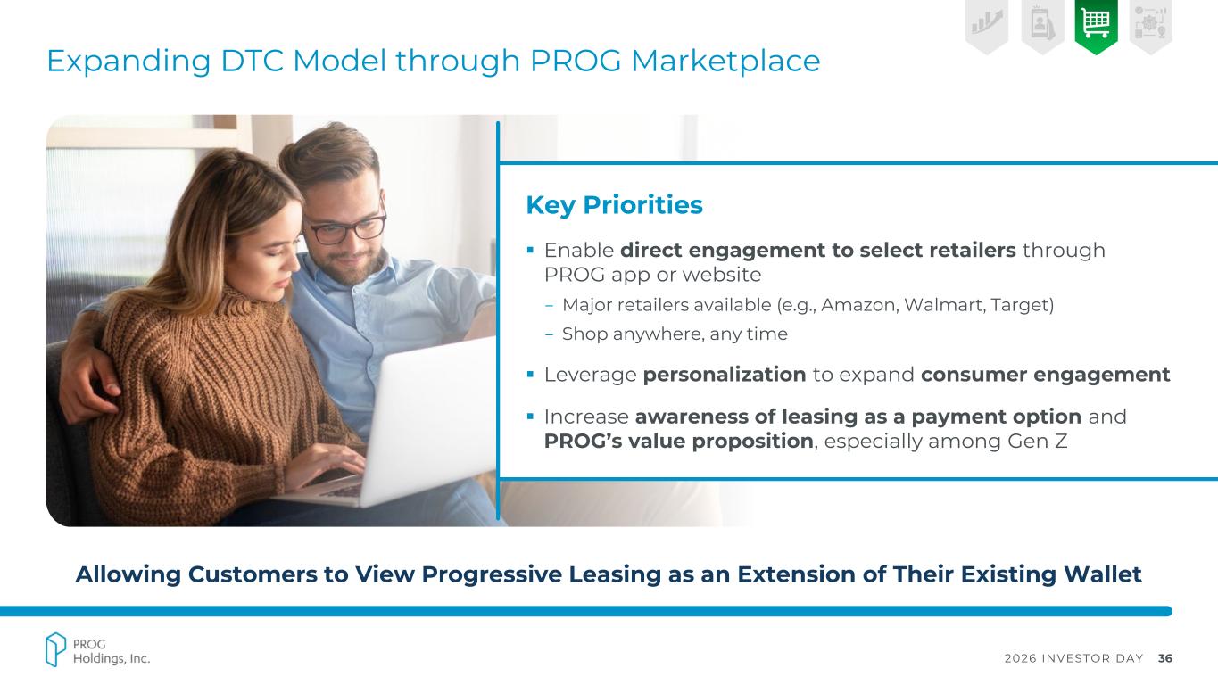 2026 INVESTOR DAY 35 Elevating Consumer and Retailer Experiences 5 – 7 Year Contracts Enable Investments in Long-term Capabilities Enhancing Consumer Experiences Streamlined application experience reducing friction Smart decisioning capabilities accelerating approval flow Improved web experience with consumer-friendly navigation and design Transforming How Retailers Work with PROG Modernizing retailer experience from end to end and reducing time to launch Faster, easier integrations enabling retailers to pilot and integrate new capabilities in days instead of weeks