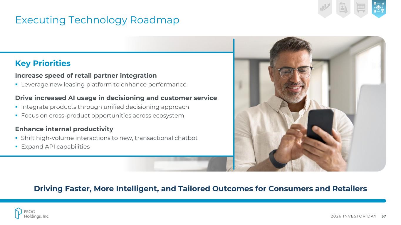 2026 INVESTOR DAY 36 Expanding DTC Model through PROG Marketplace Allowing Customers to View Progressive Leasing as an Extension of Their Existing Wallet Key Priorities ▪ Enable direct engagement to select retailers through PROG app or website - Major retailers available (e.g., Amazon, Walmart, Target) - Shop anywhere, any time ▪ Leverage personalization to expand consumer engagement ▪ Increase awareness of leasing as a payment option and PROG’s value proposition, especially among Gen Z