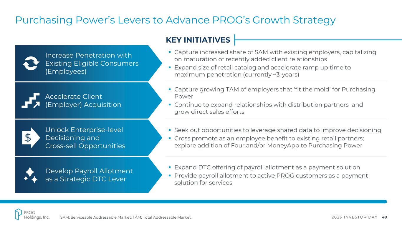 2026 INVESTOR DAY 48 Purchasing Power’s Levers to Advance PROG’s Growth Strategy SAM: Serviceable Addressable Market. TAM: Total Addressable Market. Increase Penetration with Existing Eligible Consumers (Employees) ▪ Capture increased share of SAM with existing employers, capitalizing on maturation of recently added client relationships ▪ Expand size of retail catalog and accelerate ramp up time to maximum penetration (currently ~3-years) KEY INITIATIVES Accelerate Client (Employer) Acquisition ▪ Capture growing TAM of employers that ‘fit the mold’ for Purchasing Power ▪ Continue to expand relationships with distribution partners and grow direct sales efforts Develop Payroll Allotment as a Strategic DTC Lever ▪ Expand DTC offering of payroll allotment as a payment solution ▪ Provide payroll allotment to active PROG customers as a payment solution for services Unlock Enterprise-level Decisioning and Cross-sell Opportunities ▪ Seek out opportunities to leverage shared data to improve decisioning ▪ Cross promote as an employee benefit to existing retail partners; explore addition of Four and/or MoneyApp to Purchasing Power