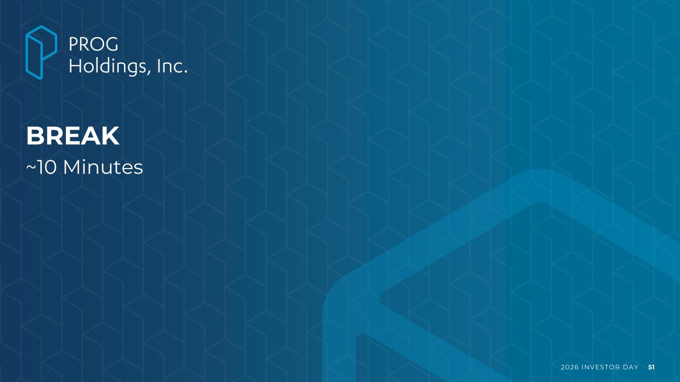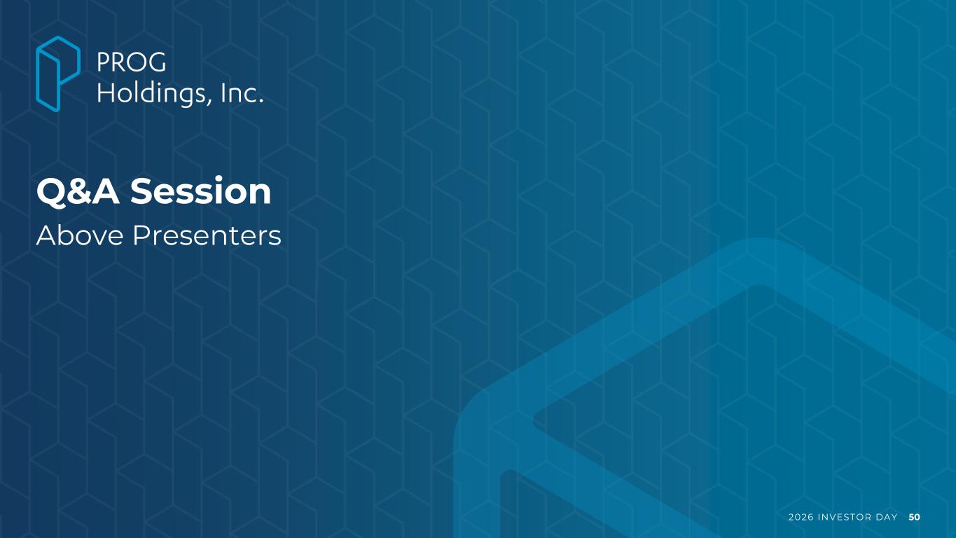 2026 INVESTOR DAY 49 Key Takeaways 1 Expanding into a large employee market through an employer-based network providing underserved customers with options to purchase products and services 2 Delivering a differentiated payment solution of payroll deduction / allotment that improves repayment outcomes and strengthens risk profile of broader PROG portfolio 3 Capitalizing on integrated data and access framework to deliver organic growth while serving as a cross-product engine to PROG’s B2B and B2C channels