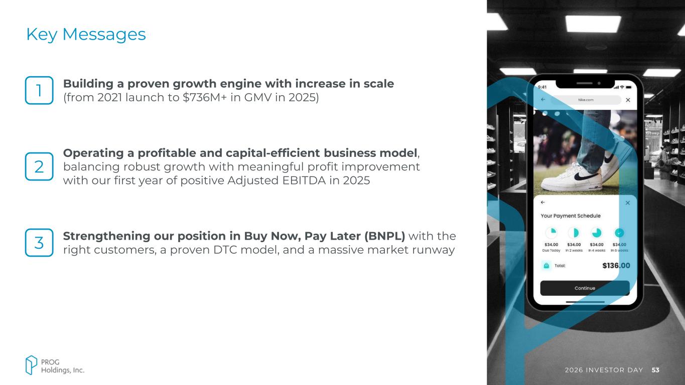 2026 INVESTOR DAY 53 Key Messages 1 Building a proven growth engine with increase in scale (from 2021 launch to $736M+ in GMV in 2025) Operating a profitable and capital-efficient business model, balancing robust growth with meaningful profit improvement with our first year of positive Adjusted EBITDA in 2025 2 Strengthening our position in Buy Now, Pay Later (BNPL) with the right customers, a proven DTC model, and a massive market runway3