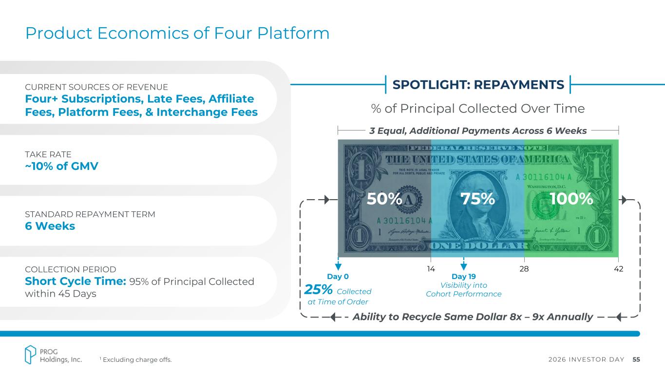 2026 INVESTOR DAY 55 Product Economics of Four Platform TAKE RATE ~10% of GMV STANDARD REPAYMENT TERM 6 Weeks CURRENT SOURCES OF REVENUE Four+ Subscriptions, Late Fees, Affiliate Fees, Platform Fees, & Interchange Fees COLLECTION PERIOD Short Cycle Time: 95% of Principal Collected within 45 Days 1 Excluding charge offs. % of Principal Collected Over Time SPOTLIGHT: REPAYMENTS 50% 75% 100% 14 28 42 3 Equal, Additional Payments Across 6 Weeks Ability to Recycle Same Dollar 8x – 9x Annually Day 19 Visibility into Cohort Performance Day 0 25% Collected at Time of Order