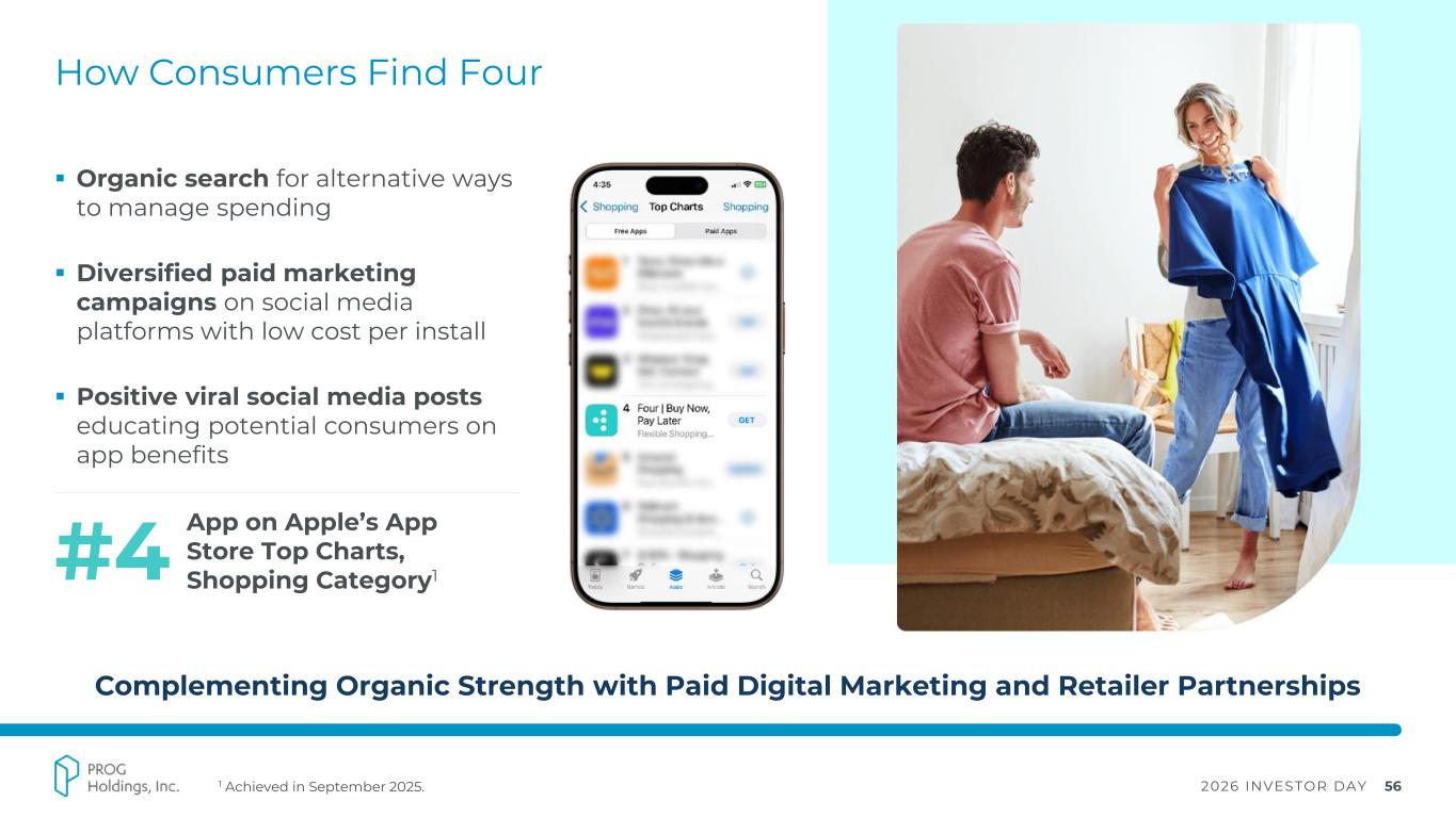 2026 INVESTOR DAY 59 SPOTLIGHT Consumer Value Proposition ▪ Low-friction entry point – non-FICO underwriting; simply connect bank account and approved within seconds ▪ Direct customer relationship – customers start in app, build loyalty with app, and grow with Four over time Four’s Role in PROG’s Inclusive Financial Ecosystem Illustrative Persona Nicole, a 23-year-old working two restaurant jobs that needs a short-term financing option to help cover purchases She has a limited credit history and prefers to avoid high-interest credit cards, but can manage a flexible installment payment plan CONSUMER One Customer Segment, Multiple Financial Needs