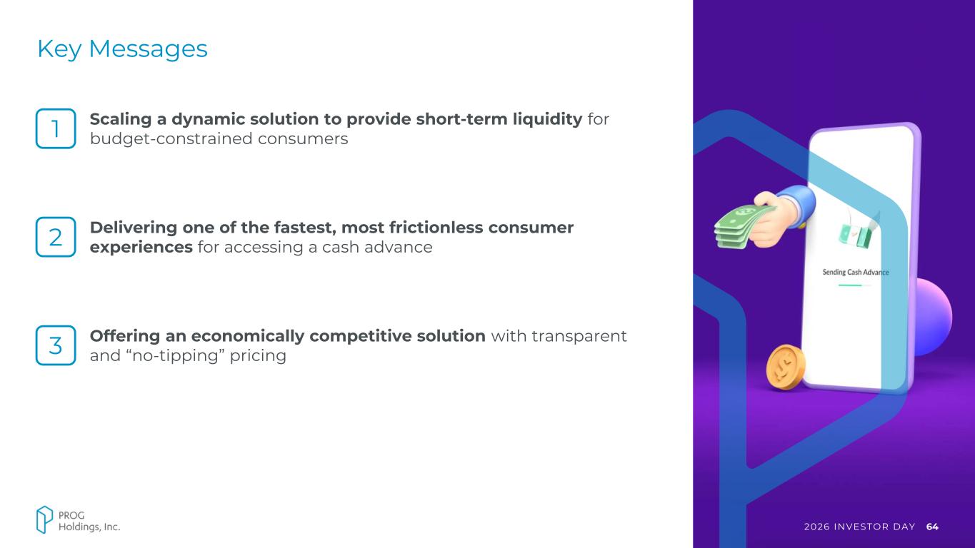 2026 INVESTOR DAY 64 Key Messages 1 Scaling a dynamic solution to provide short-term liquidity for budget-constrained consumers Delivering one of the fastest, most frictionless consumer experiences for accessing a cash advance2 Offering an economically competitive solution with transparent and “no-tipping” pricing3