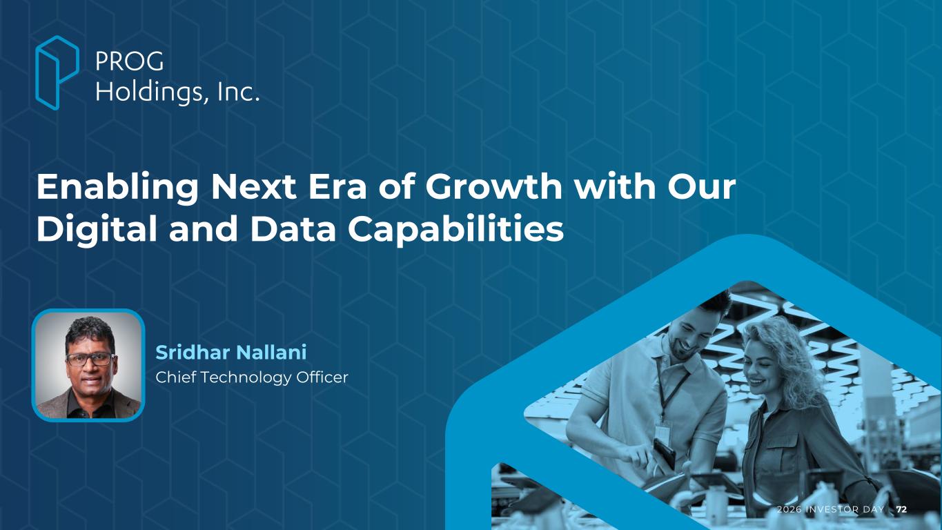 2026 INVESTOR DAY 118 Sridhar Nallani Chief Technology Officer As PROG Holdings’ Chief Technology Officer, Sridhar Nallani is responsible for the development, integration, and innovation of all customer-, partner-, and employee-facing technologies for the Company and its subsidiaries. He was named to his current role in 2023, joining PROG Holdings from leading outdoor retailer Backcountry, where he served as Executive Vice President and Chief Technology Officer. Throughout Mr. Nallani’s career he has focused on direct- to-consumer transactions in financial services and retail during time in senior leadership roles at Gap Inc., Charlotte Russe, Macy’s, and a number of other companies. Mr. Nallani was named to the 2019 National Diversity Council list of the United States’ top 50 CIOs and CTOs and serves as a technology and digital strategy advisor to the Board of Directors of private equity firm TSG Consumer Partners. He received his Bachelor’s in Computer Science from Osmania University, Telangana, India, and his Master’s in Computer Science from Louisiana State University, Baton Rouge, United States.