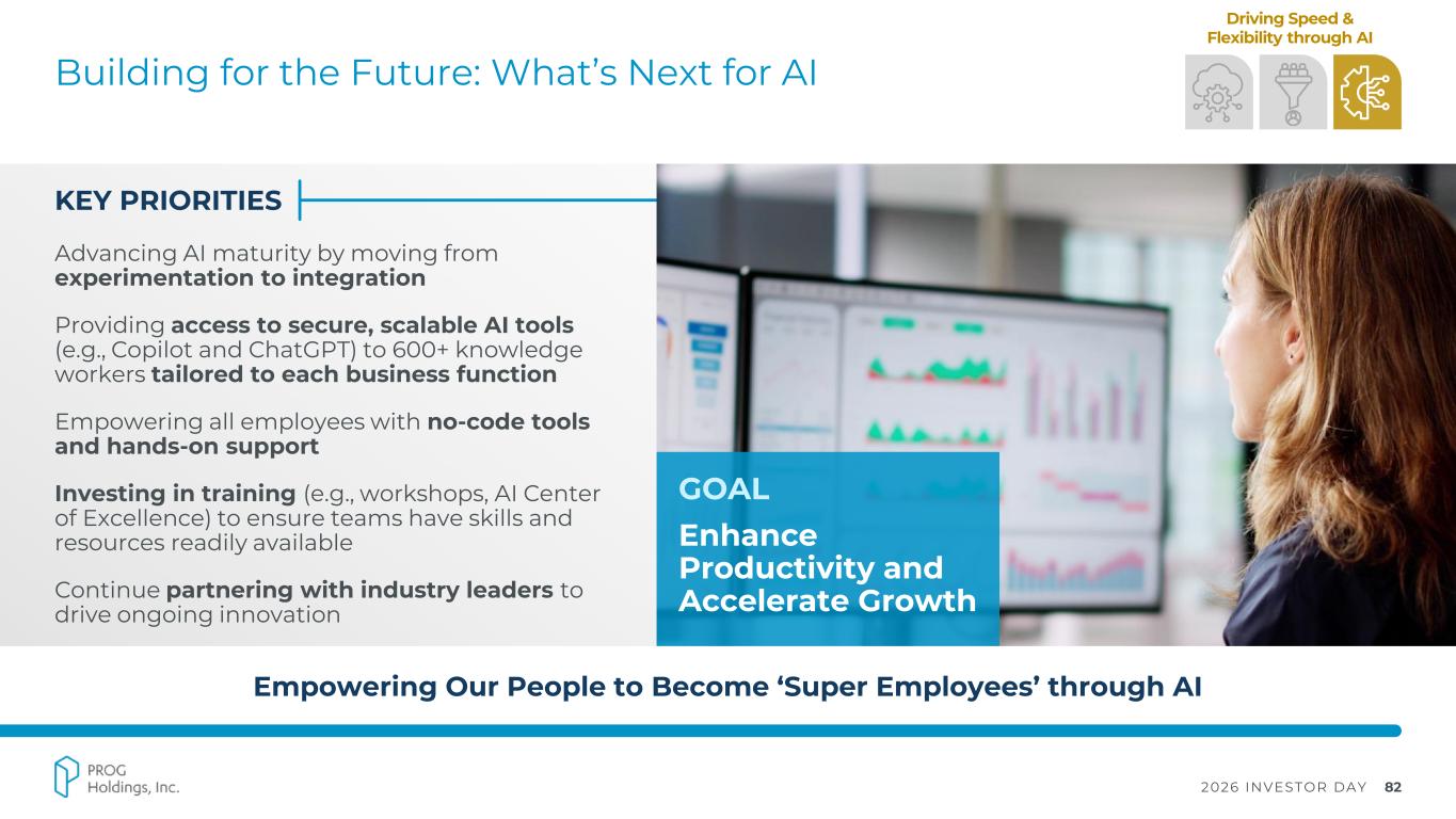 2026 INVESTOR DAY 81 Empowering Innovation through AI-first Architecture: Recent Implementations of AI Delivering Real AI-driven Value Today, While Positioning for a More AI-centric Tomorrow CUSTOMER EXPERIENCE ▪ 75% faster decisions ▪ 20% more accurate ▪ +23% marketplace conversions Leveraging AI to quickly and accurately categorize items as leasable or not ▪ 30% higher returns and reduced lead costs by 25% through recent Back-to- School campaign Integrating generative AI into marketing capabilities to create and optimize ad content automatically ▪ 75K+ transactional chat sessions per month ▪ <9% transfer to live agent Utilizing transactional, AI- driven customer chat box to increase engagement and conversion rates ▪ 18K+ questions resolved to date with 58% resolved on first attempt ▪ 24/7 availability Launched Piper+, AI- powered assistant, for employee HR and tech questions Driving Speed & Flexibility through AI MARKETING OPERATIONS HUMAN RESOURCES