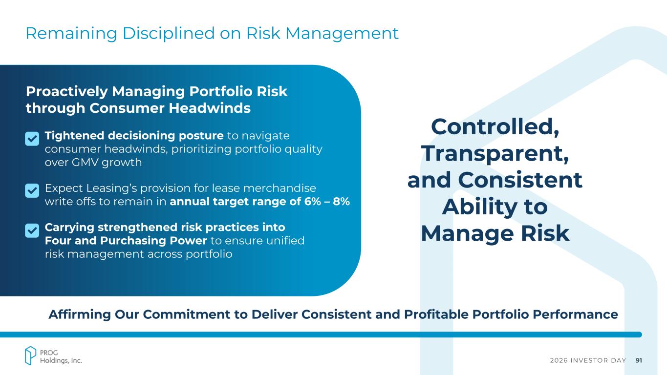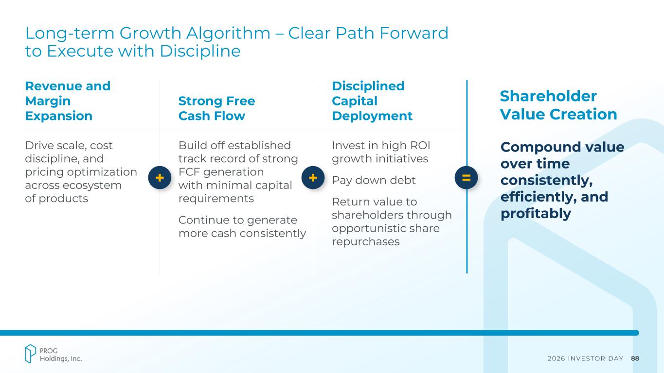 2026 INVESTOR DAY 87 KEY FACTORS ▪ Headwinds in consumer durable goods demand ▪ Retail partner disruptions ▪ Elevated consumer credit stress ▪ Investment in tech modernization ▪ Strong execution, expanding market share across existing leasing partners, and Four’s accelerated growth starting in 2024 helped mitigate macro headwinds Financial Performance Overview While Certain Macro and External Dynamics Created Short-term Headwinds, PROG is Now Positioned for Structurally Stronger, More Diversified Growth Going Forward $2.5B Consolidated GMV $2.41B Consolidated Revenue $269.2M Consolidated Adj. EBITDA1 $200.4M Consolidated FCF2 KEY METRICS (2025) $2,527 $2,409 9.6% 11.2% 0.0% 2.0% 4.0% 6.0% 8.0% 10.0% 12.0% 14.0% 16.0% 18.0% 20.0% $- $500 $1,000 $1,500 $2,000 $2,500 $3,000 2022 2025 REVENUE ($M) vs. ADJ. EBITDA MARGIN1 (%) ADJ. EPS1 $2.36 $3.51 0 0.02 0.04 0.06 0.08 0.1 0.12 0.14 0.16 0.18 0.2 $- $0.50 $1.00 $1.50 $2.00 $2.50 $3.00 $3.50 $4.00 2022 2025 1 See Appendix for GAAP to Non-GAAP reconciliation table. 2 Excludes Vive. Consolidated FCF represents cash from operations, net of capital expenditures and net investments in Four and MoneyApp loan receivables.