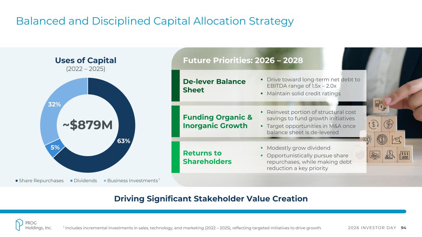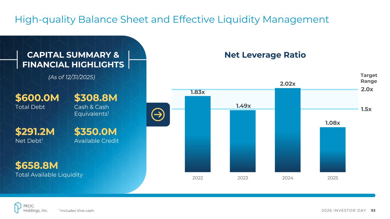 2026 INVESTOR DAY 93 2.0x 1.5x High-quality Balance Sheet and Effective Liquidity Management 1.83x 1.49x 2.02x 1.08x 2022 2023 2024 2025 Target Range Net Leverage Ratio $600.0M Total Debt $308.8M Cash & Cash Equivalents1 $291.2M Net Debt1 $350.0M Available Credit $658.8M Total Available Liquidity (As of 12/31/2025) CAPITAL SUMMARY & FINANCIAL HIGHLIGHTS 1 Includes Vive cash.