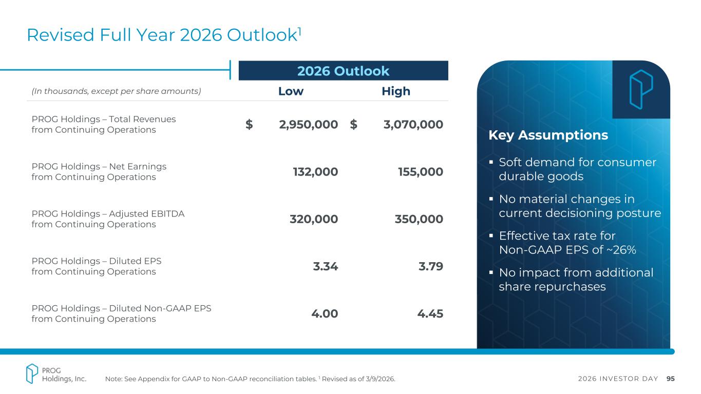 2026 INVESTOR DAY 95 Revised Full Year 2026 Outlook1 2026 Outlook (In thousands, except per share amounts) Low High PROG Holdings – Total Revenues from Continuing Operations $ 2,950,000 $ 3,070,000 PROG Holdings – Net Earnings from Continuing Operations 132,000 155,000 PROG Holdings – Adjusted EBITDA from Continuing Operations 320,000 350,000 PROG Holdings – Diluted EPS from Continuing Operations 3.34 3.79 PROG Holdings – Diluted Non-GAAP EPS from Continuing Operations 4.00 4.45 Key Assumptions ▪ Soft demand for consumer durable goods ▪ No material changes in current decisioning posture ▪ Effective tax rate for Non-GAAP EPS of ~26% ▪ No impact from additional share repurchases Note: See Appendix for GAAP to Non-GAAP reconciliation tables. 1 Revised as of 3/9/2026.