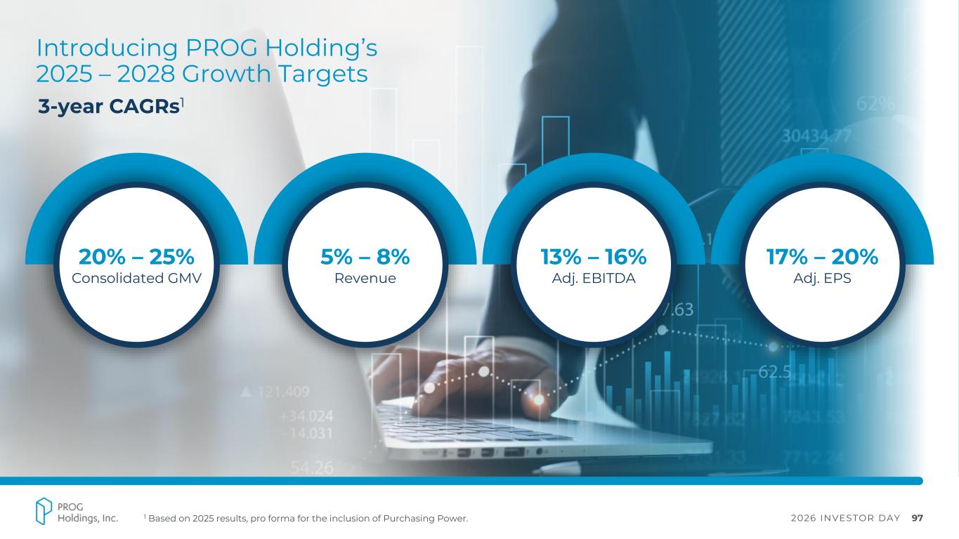 2026 INVESTOR DAY 96 Introducing 2025 – 2028 Growth Targets by Segment MSD: Mid Single Digits. LDD: Low Double Digits. GMV / Revenue Adj. EBITDA Progressive Leasing MSD MSD Four 50% – 60% 100%+ Purchasing Power LDD 25% – 35% 3-year CAGRs