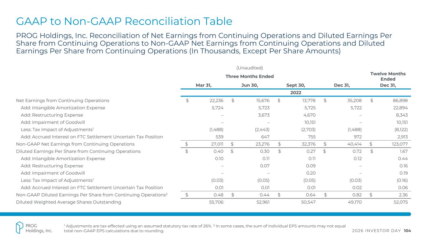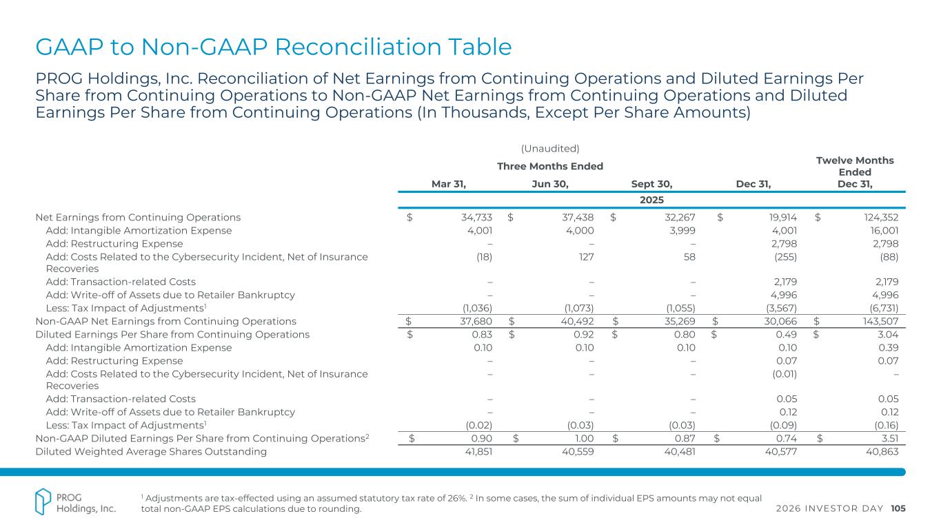 2026 INVESTOR DAY 104 GAAP to Non-GAAP Reconciliation Table 1 Adjustments are tax-effected using an assumed statutory tax rate of 26%. 2 In some cases, the sum of individual EPS amounts may not equal total non-GAAP EPS calculations due to rounding. PROG Holdings, Inc. Reconciliation of Net Earnings from Continuing Operations and Diluted Earnings Per Share from Continuing Operations to Non-GAAP Net Earnings from Continuing Operations and Diluted Earnings Per Share from Continuing Operations (In Thousands, Except Per Share Amounts) (Unaudited) Three Months Ended Twelve Months Ended Mar 31, Jun 30, Sept 30, Dec 31, Dec 31, 2022 Net Earnings from Continuing Operations $ 22,236 $ 15,676 $ 13,778 $ 35,208 $ 86,898 Add: Intangible Amortization Expense 5,724 5,723 5,725 5,722 22,894 Add: Restructuring Expense – 3,673 4,670 – 8,343 Add: Impairment of Goodwill – – 10,151 – 10,151 Less: Tax Impact of Adjustments1 (1,488) (2,443) (2,703) (1,488) (8,122) Add: Accrued Interest on FTC Settlement Uncertain Tax Position 539 647 755 972 2,913 Non-GAAP Net Earnings from Continuing Operations $ 27,011 $ 23,276 $ 32,376 $ 40,414 $ 123,077 Diluted Earnings Per Share from Continuing Operations $ 0.40 $ 0.30 $ 0.27 $ 0.72 $ 1.67 Add: Intangible Amortization Expense 0.10 0.11 0.11 0.12 0.44 Add: Restructuring Expense – 0.07 0.09 – 0.16 Add: Impairment of Goodwill – – 0.20 – 0.19 Less: Tax Impact of Adjustments1 (0.03) (0.05) (0.05) (0.03) (0.16) Add: Accrued Interest on FTC Settlement Uncertain Tax Position 0.01 0.01 0.01 0.02 0.06 Non-GAAP Diluted Earnings Per Share from Continuing Operations2 $ 0.48 $ 0.44 $ 0.64 $ 0.82 $ 2.36 Diluted Weighted Average Shares Outstanding 55,706 52,961 50,547 49,170 52,075