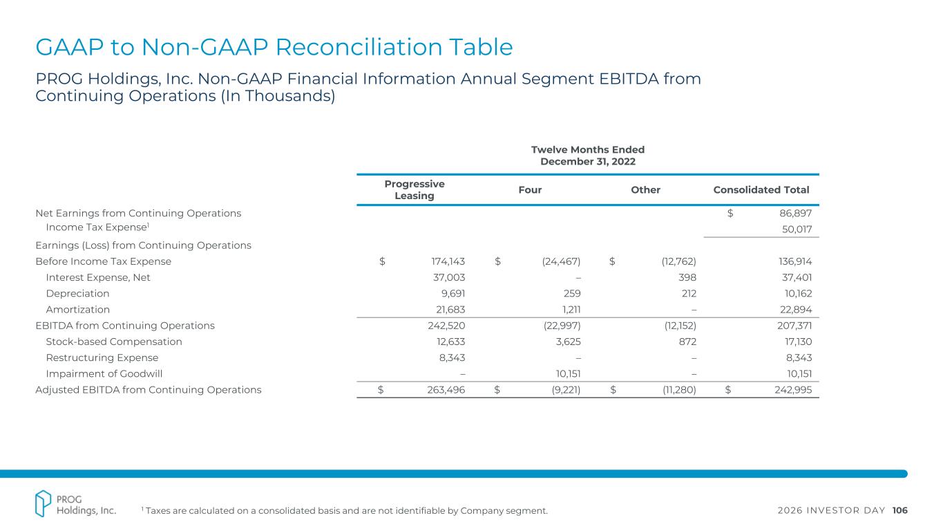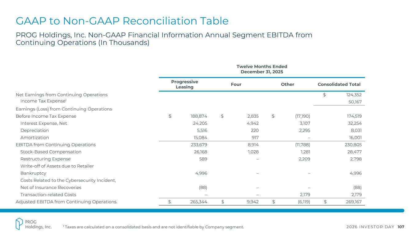 2026 INVESTOR DAY 106 GAAP to Non-GAAP Reconciliation Table 1 Taxes are calculated on a consolidated basis and are not identifiable by Company segment. PROG Holdings, Inc. Non-GAAP Financial Information Annual Segment EBITDA from Continuing Operations (In Thousands) Twelve Months Ended December 31, 2022 Progressive Leasing Four Other Consolidated Total Net Earnings from Continuing Operations $ 86,897 Income Tax Expense1 50,017 Earnings (Loss) from Continuing Operations Before Income Tax Expense $ 174,143 $ (24,467) $ (12,762) 136,914 Interest Expense, Net 37,003 – 398 37,401 Depreciation 9,691 259 212 10,162 Amortization 21,683 1,211 – 22,894 EBITDA from Continuing Operations 242,520 (22,997) (12,152) 207,371 Stock-based Compensation 12,633 3,625 872 17,130 Restructuring Expense 8,343 – – 8,343 Impairment of Goodwill – 10,151 – 10,151 Adjusted EBITDA from Continuing Operations $ 263,496 $ (9,221) $ (11,280) $ 242,995