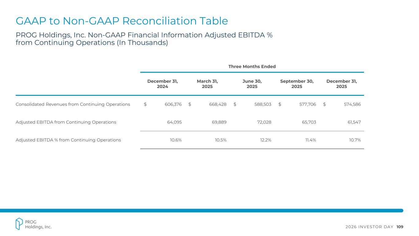 2026 INVESTOR DAY 108 GAAP to Non-GAAP Reconciliation Table PROG Holdings, Inc. Non-GAAP Financial Information Adjusted EBITDA % from Continuing Operations (In Thousands) Three Months Ended December 31, 2021 March 31, 2022 June 30, 2022 September 30, 2022 December 31, 2022 Consolidated Revenues from Continuing Operations $ 630,235 $ 693,348 $ 631,926 $ 607,429 $ 594,211 Adjusted EBITDA from Continuing Operations 63,349 59,506 47,584 62,534 73,371 Adjusted EBITDA % from Continuing Operations 10.1% 8.6% 7.5% 10.3% 12.3%