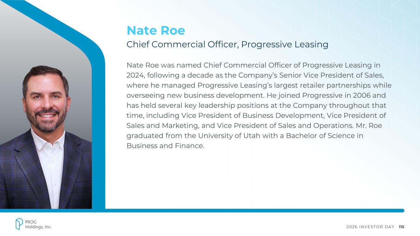 2026 INVESTOR DAY 115 Nate Roe Chief Commercial Officer, Progressive Leasing Nate Roe was named Chief Commercial Officer of Progressive Leasing in 2024, following a decade as the Company’s Senior Vice President of Sales, where he managed Progressive Leasing’s largest retailer partnerships while overseeing new business development. He joined Progressive in 2006 and has held several key leadership positions at the Company throughout that time, including Vice President of Business Development, Vice President of Sales and Marketing, and Vice President of Sales and Operations. Mr. Roe graduated from the University of Utah with a Bachelor of Science in Business and Finance.