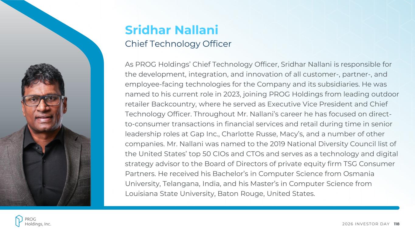 2026 INVESTOR DAY 117 John Trainor President, Four Technologies John Trainor is the President of Four Technologies, our Buy Now, Pay Later business. He has more than 25 years of experience as a business and technology leader, with significant expertise in consumer financial services and payment options, retail, connected devices, digital marketing, and other consumer-facing digital experiences. Prior to joining PROG Holdings, John served as the Chief Technology Officer of Wahoo Fitness and, before that, as Chief Information Officer of Aaron’s, Inc. In both of those roles, he led teams responsible for designing and implementing consumer-facing technology platforms that enhanced the consumer experience and drove significant incremental revenue. John received a Bachelors of Electrical Engineering degree from the Georgia Institute of Technology. He previously served as the Chair of the Board of Directors for the Technology Association of Georgia and was recognized as the Chief Information Officer of the Year by Georgia CIO Leadership Association.