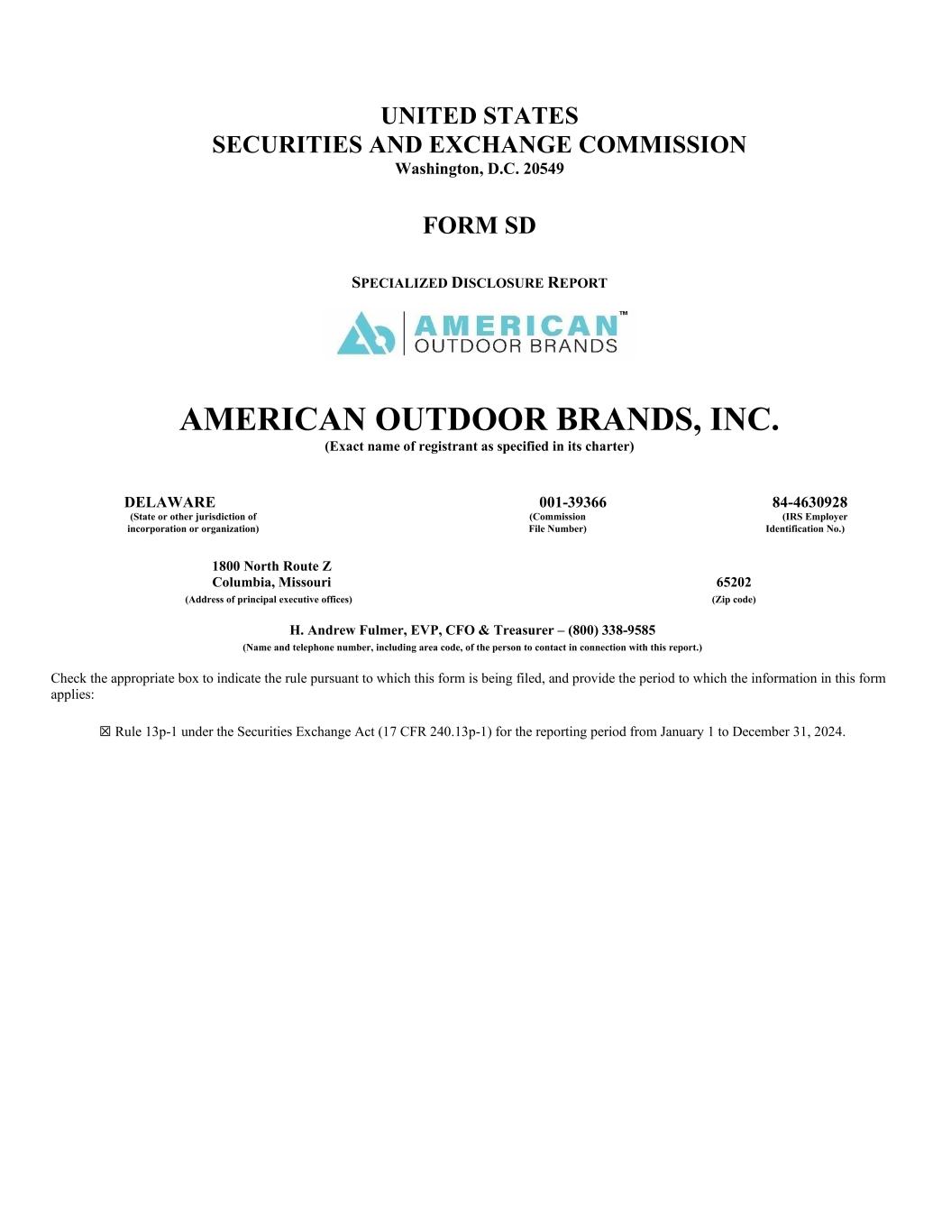 UNITED STATES SECURITIES AND EXCHANGE COMMISSION Washington, D.C. 20549 FORM SD SPECIALIZED DISCLOSURE REPORT AMERICAN OUTDOOR BRANDS, INC. (Exact name of registrant as specified in its charter) DELAWARE 001-39366 84-4630928 (State or other jurisdiction of (Commission (IRS Employer incorporation or organization) File Number) Identification No.) 1800 North Route Z Columbia, Missouri 65202 (Address of principal executive offices) (Zip code) H. Andrew Fulmer, EVP, CFO & Treasurer – (800) 338-9585 (Name and telephone number, including area code, of the person to contact in connection with this report.) Check the appropriate box to indicate the rule pursuant to which this form is being filed, and provide the period to which the information in this form applies: ☒ Rule 13p-1 under the Securities Exchange Act (17 CFR 240.13p-1) for the reporting period from January 1 to December 31, 2024.